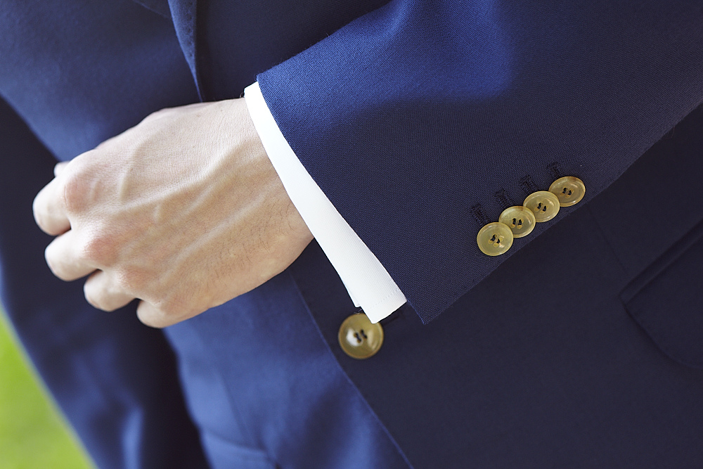 Marynarka jest także ręcznie stębnowana, co ma jej nadać bardziej sportowy charakter. Stębnowanie to przeszycie tkaniny ubraniowej w taki sposób, że ścieg jest widoczny z zewnętrznej strony materiału. Można to zrobić i ręcznie, i oczywiście maszynowo. Sebastian oferuje tylko stębnowanie ręczne. Maszynowe to droga na skróty, nieprowadząca do krawiectwa miarowego, a co najwyżej do półmiarówki z hal produkcyjnych, czyli made to measure. Interesujący efekt dało zastosowanie jasnych, przezroczystych guzików z rogu. Dodają one lekkości i letniego charakteru marynarce.