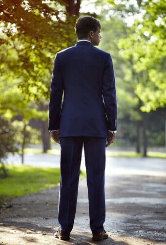 Garnitur to model padok na dwa guziki, oba zapięte. Zdecydowaliśmy się umiejscowić górny guzik kilka cm nad linią talii, a dolny kilka cm poniżej. Umiejscowienie dolnego guzika było kluczowe, bo im bliżej kieszeni marynarki tym bardziej przypomina normalny garnitur na dwa guziki, gdzie dolny guzik jest zawsze odpięty. Tą wersję padoka można zresztą nosić z dolnym guzikiem odpiętym.