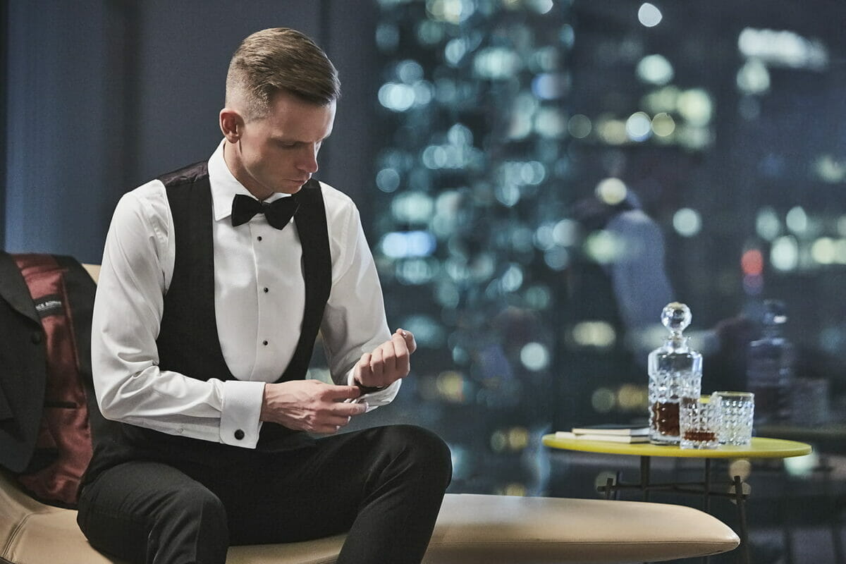 Dlaczego Daniel Craig tak dobrze wygląda w smokingu? Bo trzyma się kilku prostych zasad. I nawet jeśli je łamie, to w gruncie rzeczy pozostaje blisko klasycznych wzorców. Przypomnijmy sobie premierę filmu Nie czas umierać, gdzie wystąpił w różowej marynarce z welwetu. Choć kolor robił mocne wrażenie, to jednak krój był tradycyjny, podobnie jak wszystkie elementy zestawu black tie. Czarna mucha i koszula smokingowa to najważniejsze z nich.
