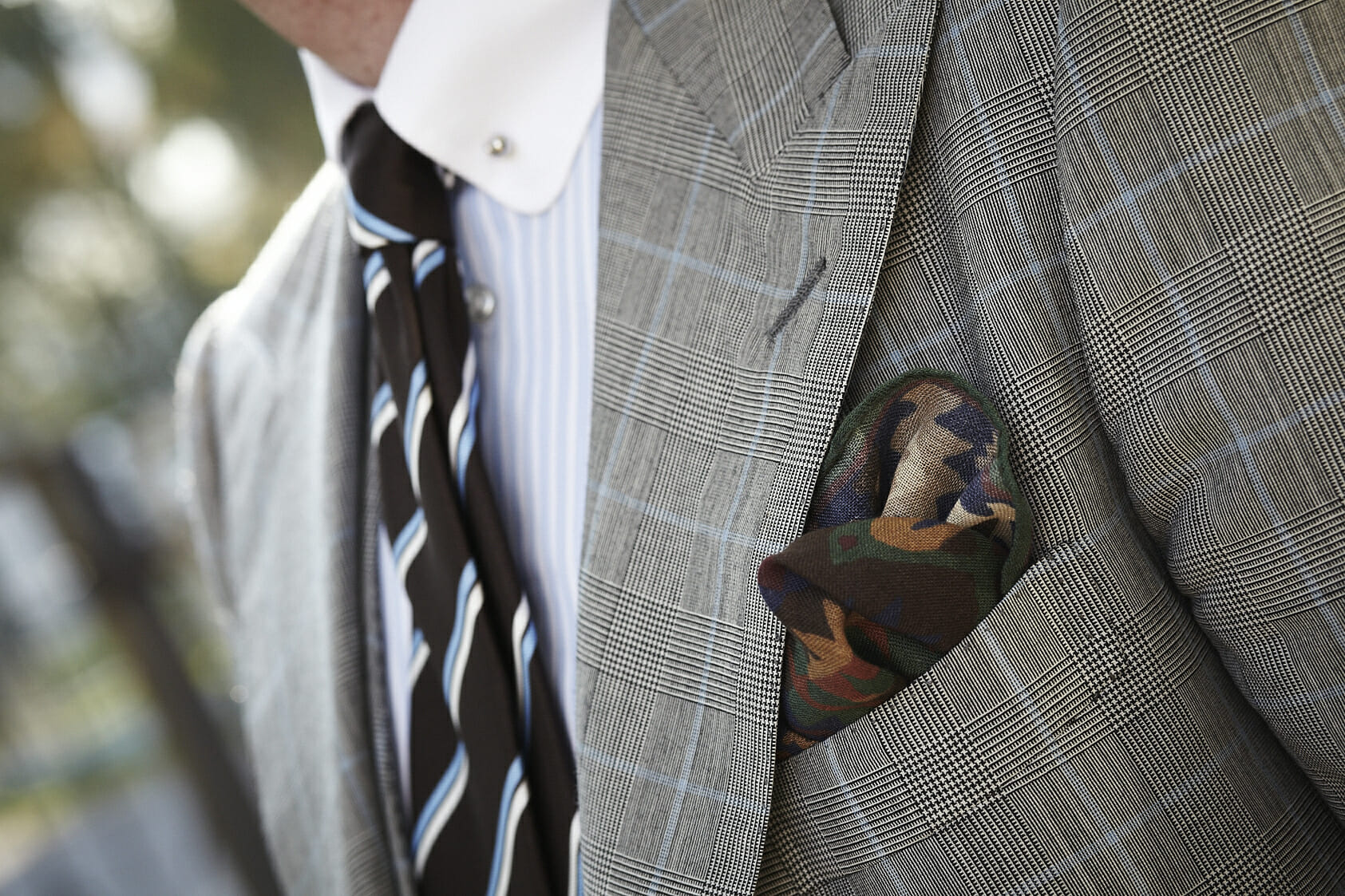 Na zdjęciach demonstruję jak połączyć cztery wzory: dwa prążki, kratę i wzór typu kilim. Prążek koszuli ma wąski rozstaw w przeciwieństwie do paska na krawacie. Kiedy mieszamy dwa takie same wzory, muszą one być od siebie wyraźnie różne. Odmienna zasada obowiązuje przy łączeniu dwóch różnych wzorów. Dlatego rozstaw paska na krawacie jest spójny wielkością z niebieską kratą na garniturze. Krawat jest łącznikiem między drobnym prążkiem koszuli, a dużą kratą na garniturze. Zestaw uzupełnia poszetka we wzór w esy floresy nawiązujący do tradycyjnych perskich dywanów typu kilim, które odznaczają się bogatą kolorystyką. Wprowadza ona pożądany przez niektórych efekt sprezzatury (nonszalancji) w ubiorze.