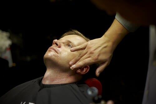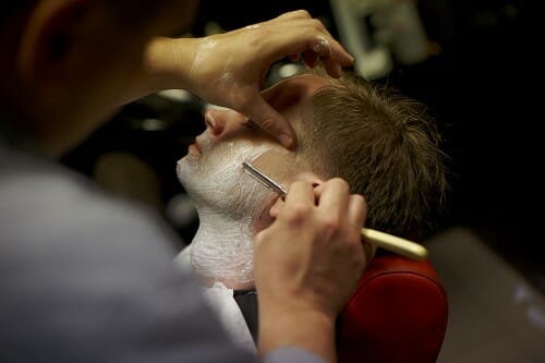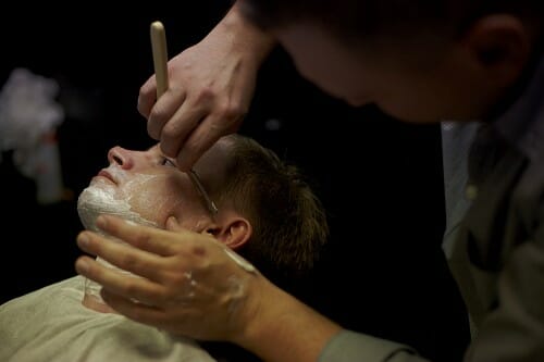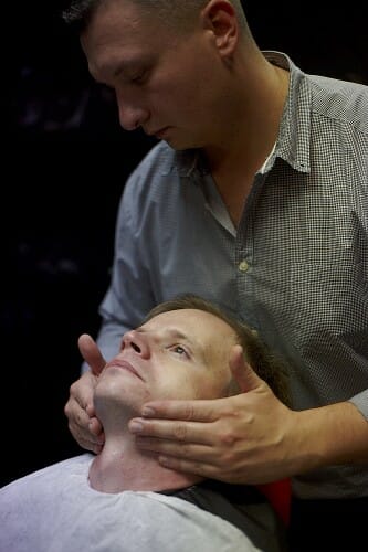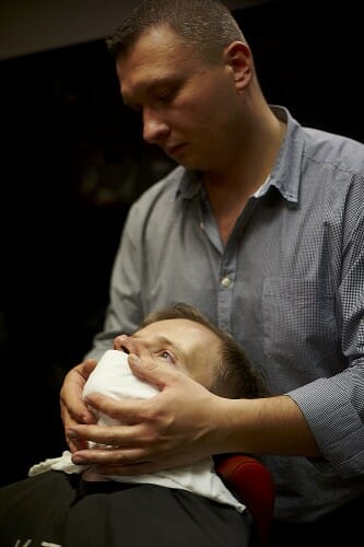 Spytałem Patryka o technikę golenia brzytwą. Odpowiedział: ruchy ręką muszą być w pionie, zdecydowane, od góry do dołu lub z dołu do góry. Maszynką można zmienić kierunek podczas golenia, tutaj nie ma takiej możliwości. Kąt ustawienia brzytwy w stosunku do twarzy nie powinien być większy niż 30 stopni. Do skóry trzeba podejść bez nerwowości. Pytany, jak się nauczyć samemu golić brzytwą, odpowiedział, żeby zacząć od trenowania golenia włosów na własnych rękach.