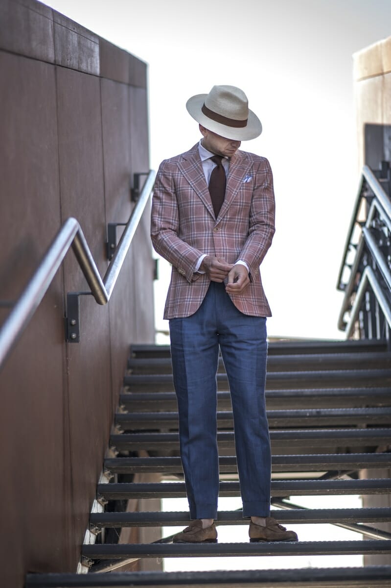 Najlepszą odpowiedzią na lato, jaką wypracowało tradycyjne krawiectwo europejskie, jest giacca napoletana. Neapolitańska marynarka, bo to o niej mowa, przyjmuje różne formy (więcej na ten temat w artykule o włoskich szkołach krawieckich). Najbardziej klasyczna z nich wygląda właśnie tak jak na powyższym zdjęciu.