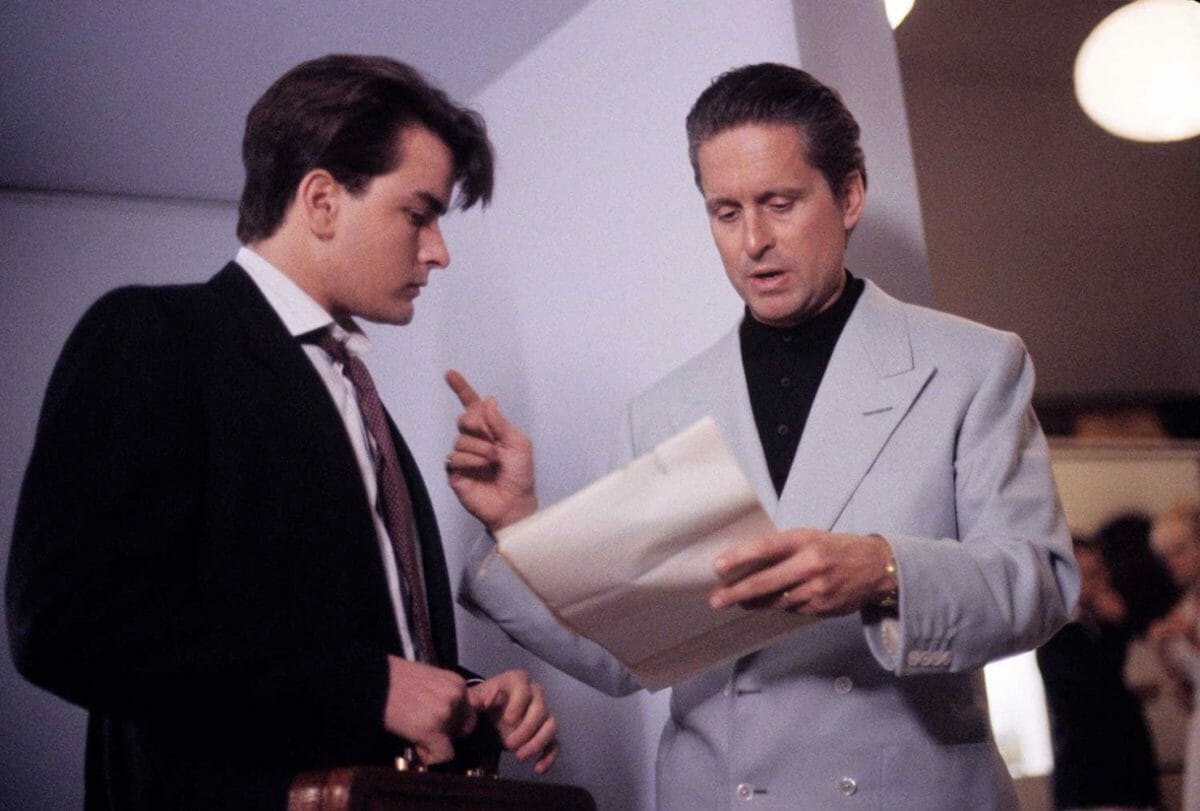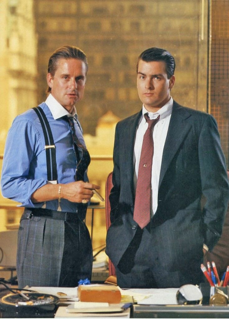 Może się wydawać, że bohaterowie są ubrani podobnie, ale wprawne oko dostrzeże zasadnicze różnice. Sheen na ogół wygląda zaledwie poprawnie. Jego koszulom button-down i ciemnemu garniturowi w delikatny prążek z pozoru nic nie brakuje, a szpilka do krawata jest ciekawym akcentem. Ale w kluczowej scenie wzrok widza przykuwa tylko Douglas w efektownej koszuli winchester i sartorialnych spodniach w kratę windowpane, które trzymają się na fantastycznych szelkach. Chociaż nie ma na sobie marynarki, nikt nie może mieć wątpliwości, kto tu rządzi. Oczywiście o tym wrażeniu w znacznym stopniu zdecydował sposób gry Michela Douglasa, ale i swada w doborze ubrań oraz dodatków ma tu wielkie znaczenie.