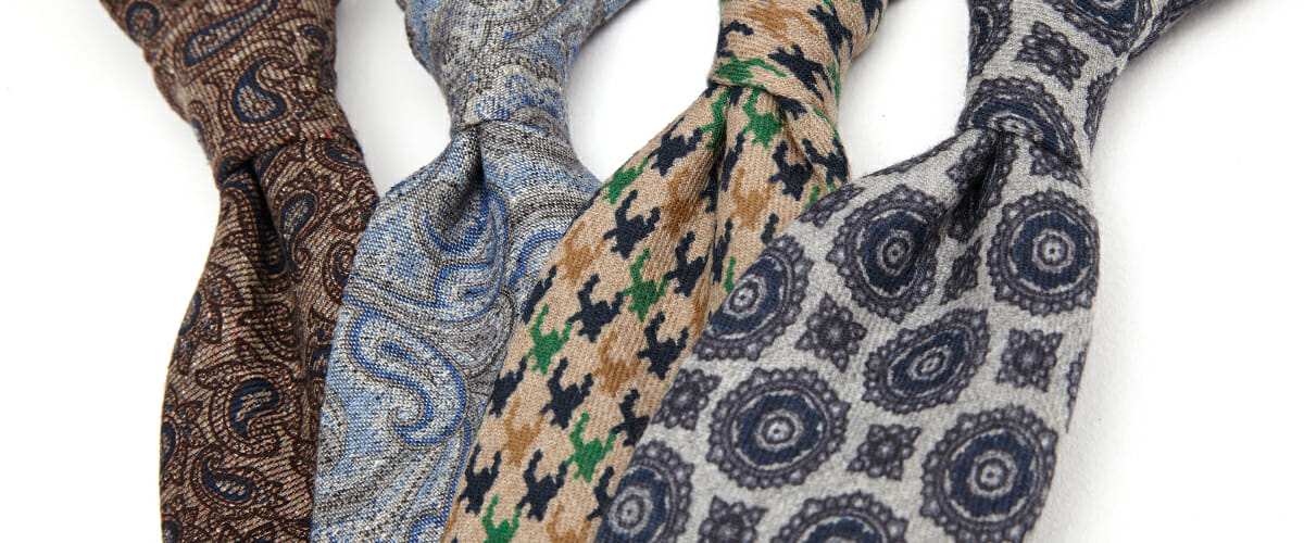 Na specjalną uwagę zasługują krawaty z wełny typu challis. To mięsista i miękka tkanina, którą tradycyjnie ozdabia się wzorami roślinnymi i geometrycznymi. Na matowej wełnie śmiałe kolory nabierają dyskretnej głębi.