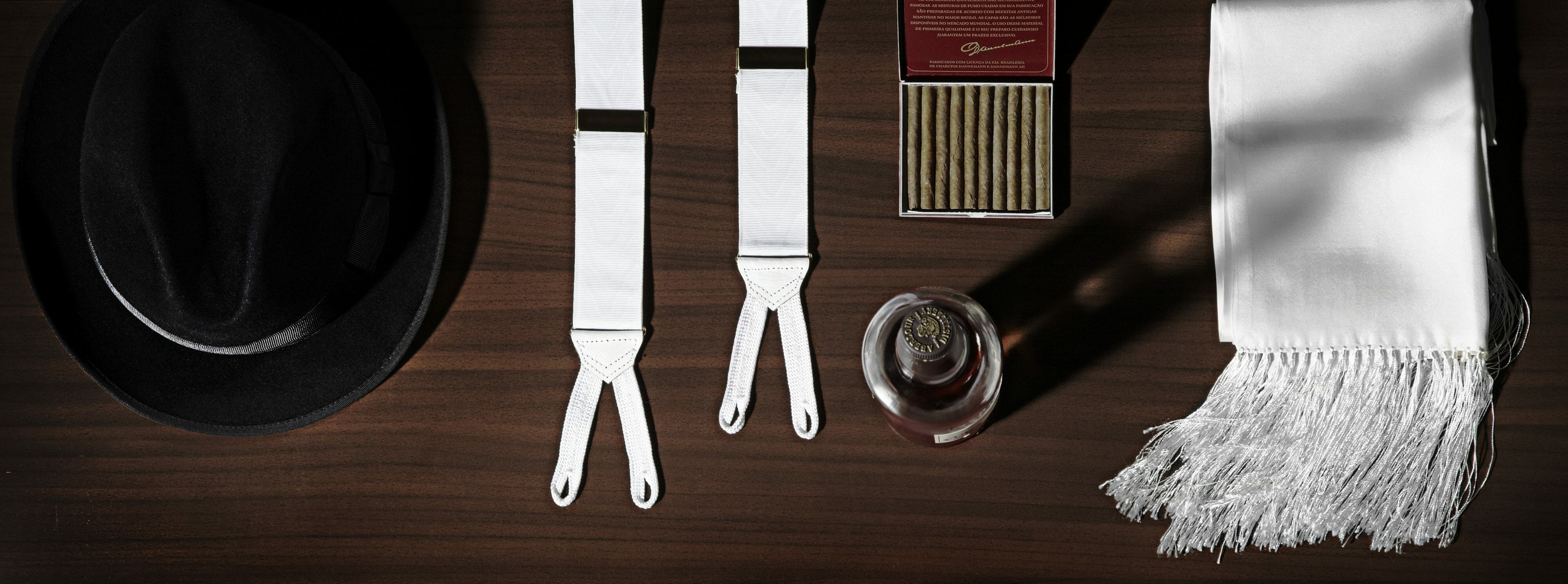 Szelki James’a Bond’a użyte w Casino Royale. Biały jewabdny szalik do opery, whisky, czarny kapelusz