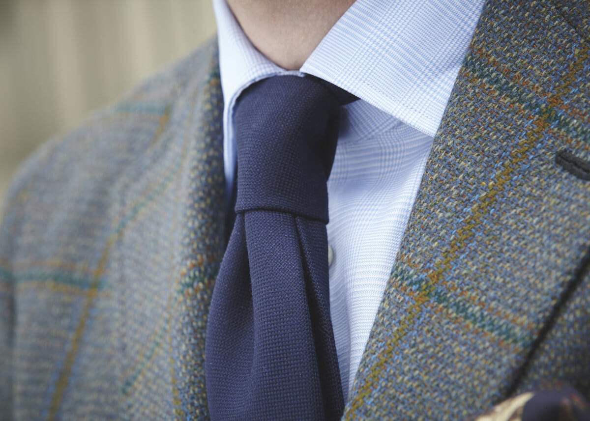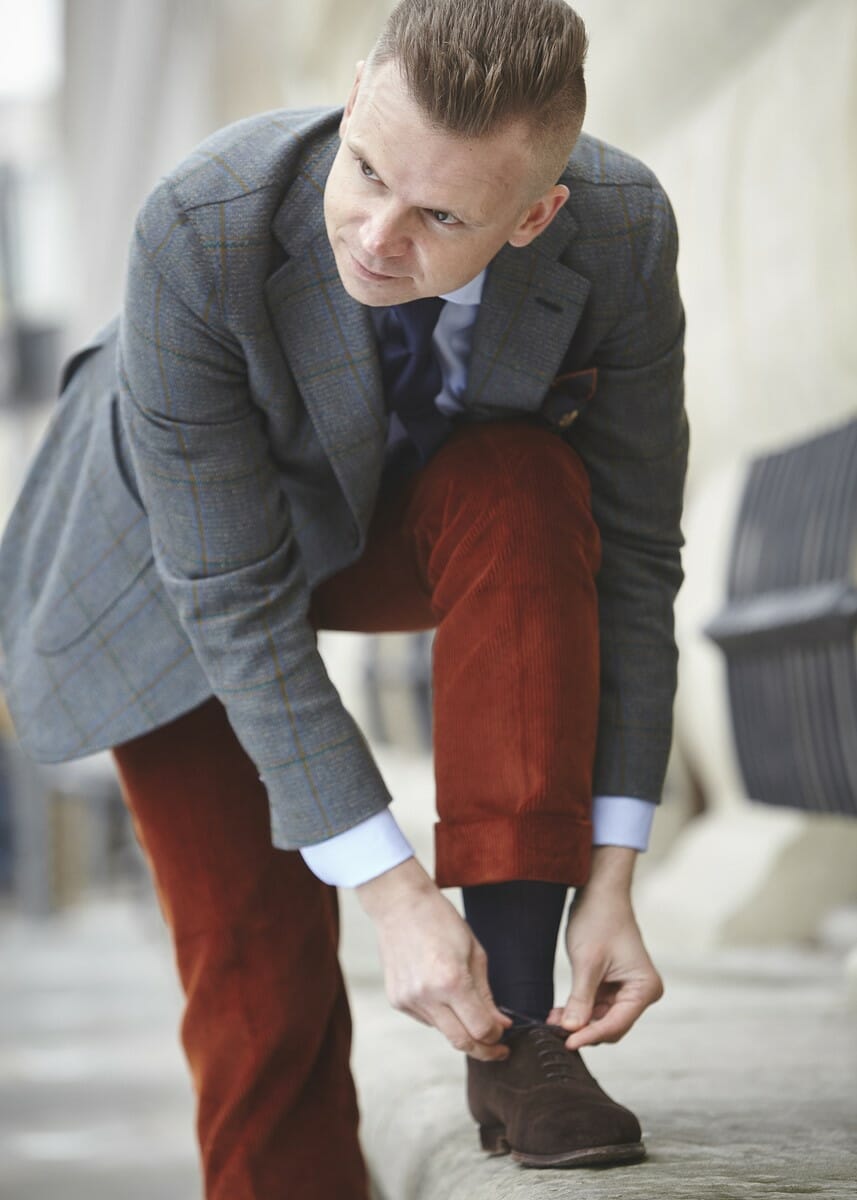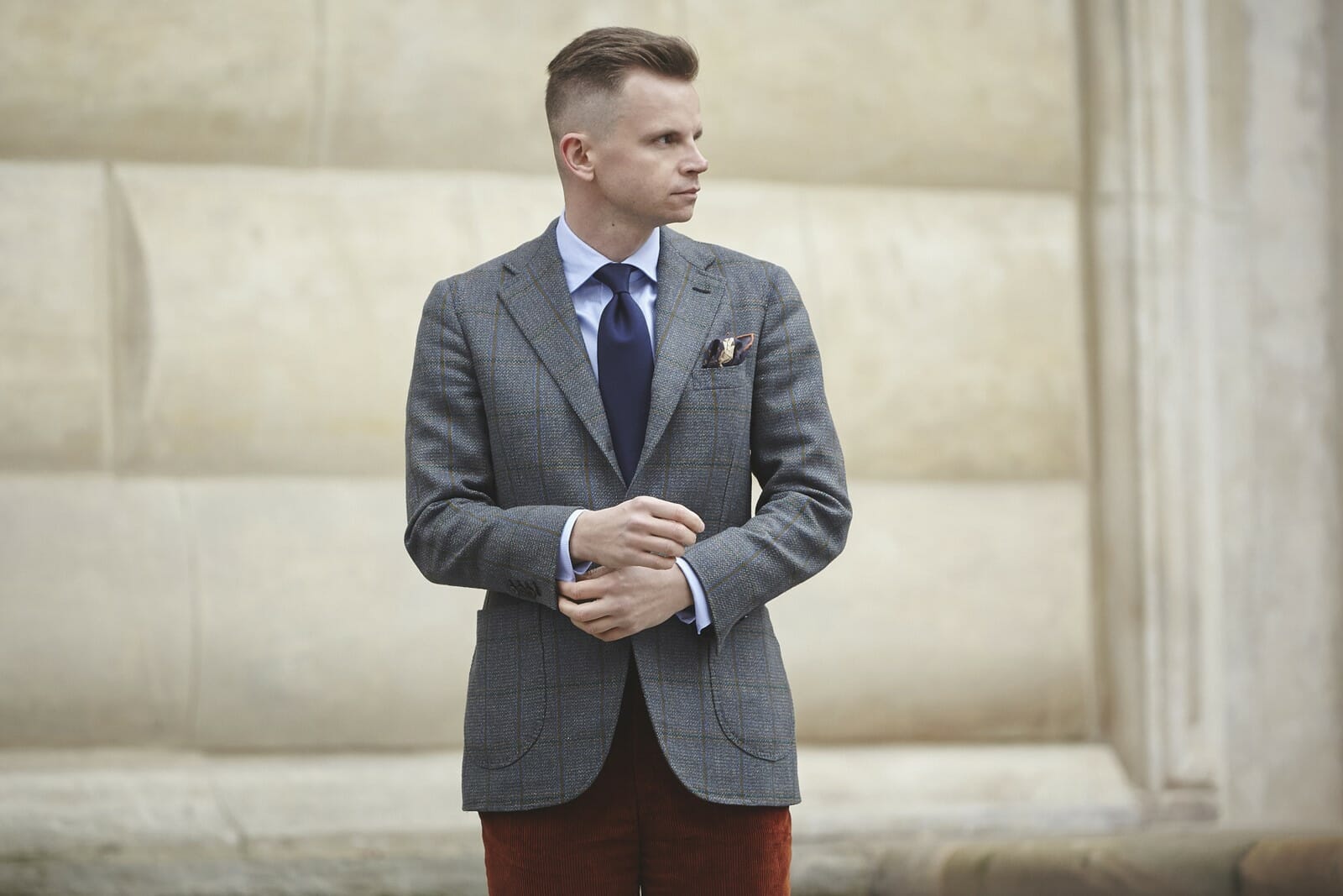 Skąd wyrażenie „na sportowo” w tytule? Stali czytelnicy wiedzą, że zestaw koordynowany składający się z tweedu i sztruksu był przez Brytyjczyków chętnie stosowany do uprawiania takich aktywności jak jazda na rowerze. Tweed wybrany przez mnie jest naprawdę unikalny. Nie widziałem w żadnym innym próbniku materiału o tak wielu barwach. Marynarka szczególnie ładnie prezentuje się na zewnątrz przy świetle dziennym. Tkanina pochodzi z archiwum W.Bill. Zostało mi jej jeszcze niecałe 4 metry.