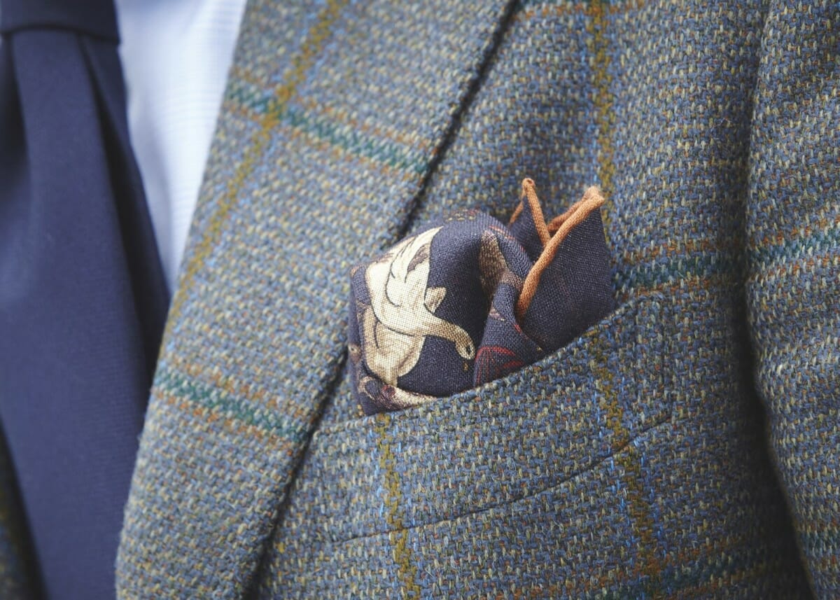 W kieszonce piersiowej baczne oko zauważy matową poszetkę. Pochodzi z angielskiego miasteczka Macclesfield, które słynie z drukowanych tkanin. To także jeden z ciekawszych elementów jesienno-zimowej kolekcji w moim sklepie internetowym. Skład prezentowanej poszetki to 70% wełny i 30% jedwabiu. Poszetka jest oczywiście wykończona ręcznym rulonikiem. Wykonano ją w moim ulubionym rozmiarze 40 x 40 – nigdy nie schowa się w brutaszy, ale też nie wypycha jej jak chusteczki o półmetrowym boku. Poszetka jest w większości granatowa, tym samym nawiązuje do krawata. Jej pomarańczowy rant współgra ze spodniami i z jednym z wątków marynarki. Jak widać, nawet śmiały kolor można okiełznać. Nie bójmy się ożywiać naszej garderoby!