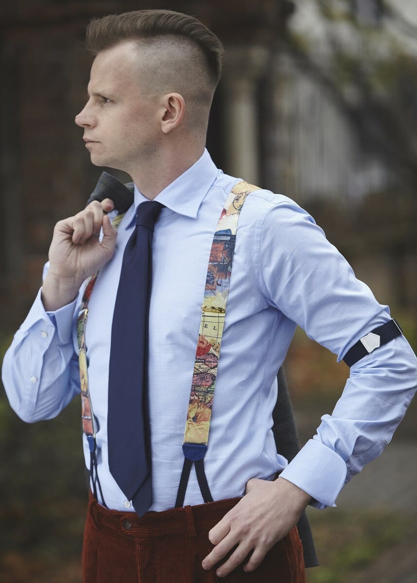 A może zainteresowały Was jeszcze kolorowe szelki? Wyprodukowała je dla mnie słynna angielska manufaktura Albert Thurston. To najstarszy spośród działających do dziś producentów szelek, dostarczający to akcesorium między innymi na plan serii o Jamesie Bondzie. Mój wzór nawiązuje do wielkich odkryć geograficznych. Pasował tu kolorystycznie. Mogłem założyć po prostu pasek, ale uznałem, że właśnie te szelki będą dobrym uzupełnieniem zestawu.