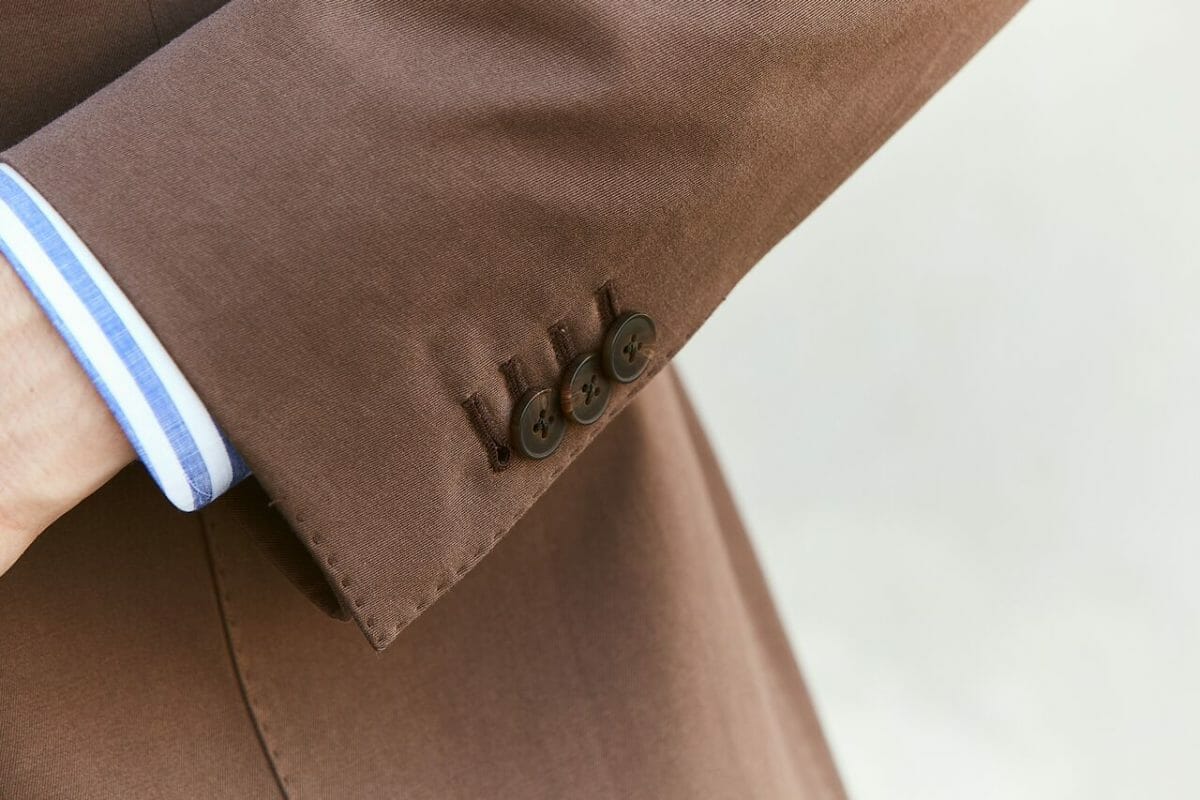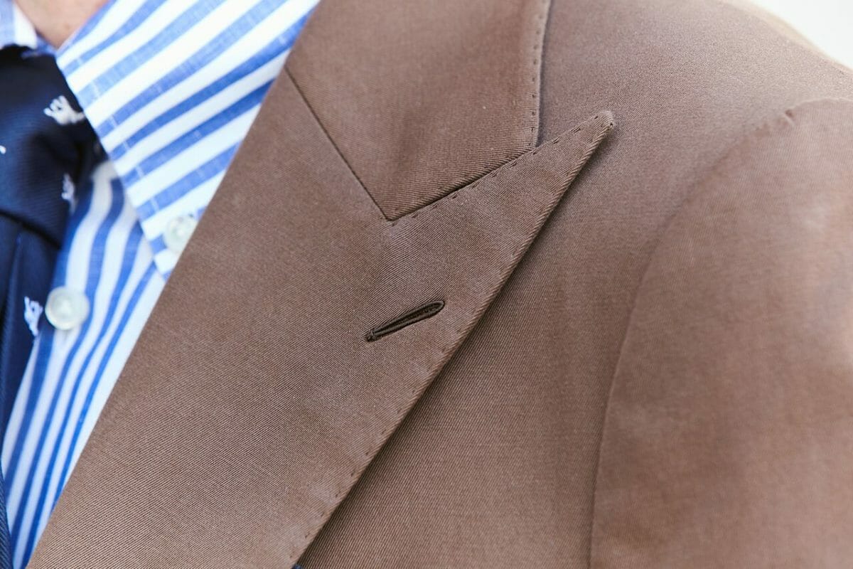 Zaprezentowany model powstał w naszej pracowni w systemie MTM. Posiada cechy, które czynią go nieformalnym, można by rzec sportowym garniturem – lekka konstrukcja, nakładane kieszenie i bawełniana, swobodna tkanina. Nie mogło zabraknąć sartorialnych smaczków jak ręcznie wykończona butonierka (milanese), efektowne stębnowanie i koszulowe wszycie rękawa (spalla camicia).