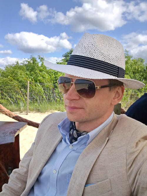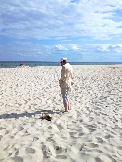 Jedna z głównych myśli przewodnich dandysa to wyróżniać się na tle innych. Można to zrobić, zakładając ciemny ubiór na plażę, jednak będzie to stanowiło dysonans z naturą. O wiele lepszy jest jasny zestaw koordynowany z lnu z elementami dandy, takimi jak kapelusz słomkowy, okulary aviator, fular we wzór paisley czy błękitna poszetka.