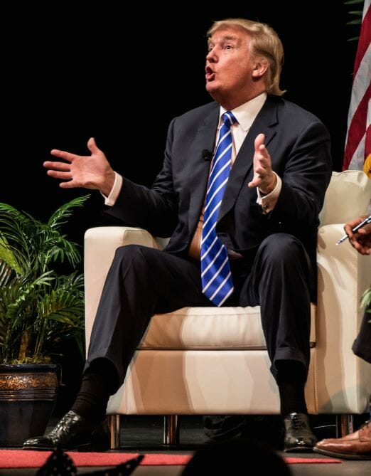 Trump prawie zawsze wiąże krawaty windsorem. Nic dziwnego, że stara się zrównoważyć pełną twarz szerokim węzłem. Niestety w wielu wypadkach windsor Trumpa jest bardzo krótki. Lepszy byłby po prostu four-in-hand – mięsisty krawat pozwoliłby uformować węzeł nie tylko szeroki, ale też dłuższy, co trochę wyciągnęłoby optycznie twarz miliardera.