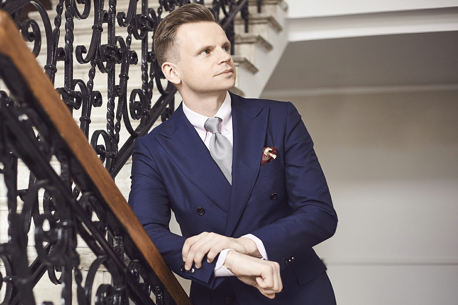 Reedycji naszego dwurzędowca towarzyszy sesja zdjęciowa wykonana przez Macieja Ciocha w jednej z przedwojennych warszawskich kamienic. Przy okazji tej sesji chciałem pokazać, w jaki sposób można wpisać róż w dzienny zestaw formalny. Wiele osób uważa, że różowe koszule wolno nosić tylko poza czasem pracy. Ale gdy mamy na sobie klasyczny garnitur dwurzędowy, to nie zawsze musimy go uzupełniać śnieżnobiałą koszulą. Odrobina różu, na przykład na prążkowanej koszuli, doskonale ociepla wizerunek.