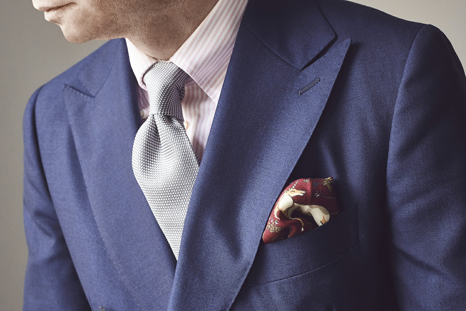 Garnitur dwurzędowy full canvas, szary krawat i poszetka w jednorożce