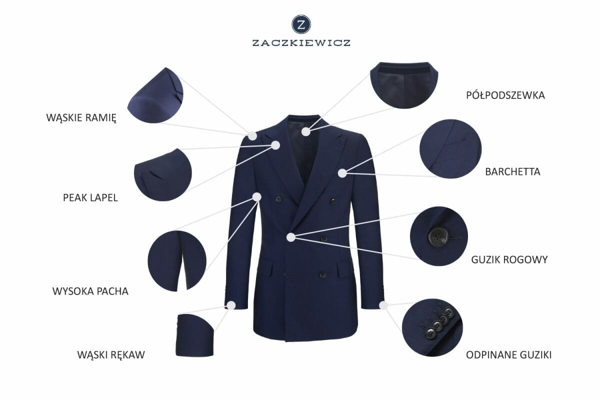 Zacznijmy od kwestii podstawowych. Garnitur jest granatowy, w dyskretny prążek kredowy (we Włoszech nazywany gessato). Materiał flanelowy w prążek to ukłon w stronę stylu włoskich przemysłowców. Rozstaw guzików w marynarce to klasyczne 6 x 2. Klapy są średniej szerokości – choć w dwurzędówce efektowniej prezentują się odrobinę szersze klapy. Marynarka ma kieszenie proste z patkami, typowe dla średniego szczebla formalności.