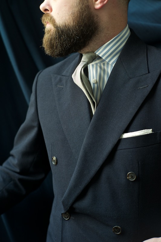 W zeszłym roku wyszedł nowy wzornik o nazwie Fresco II. Pojawiły się zarówno nowe wzory jak i kolory, w tym bardzo jasny szary i bardzo jasny beż. Są też kratki windowpane oraz prążki. Nowością jest fresco z 30% dodatkiem moheru. Fresco jest dostępne w trzech gramaturach: 250, 310, 435. Wśród klientów Studia Zaczkiewicz największym zainteresowaniem cieszy się niebieskie fresco numer 0520. Szczegółów nie zdradzę, wkrótce się dowiecie, ale następny projekt to będzie marynarka z fresco. Jej wykonawca zaskoczy wszystkich. Tej firmy nie było dotąd na moim blogu.