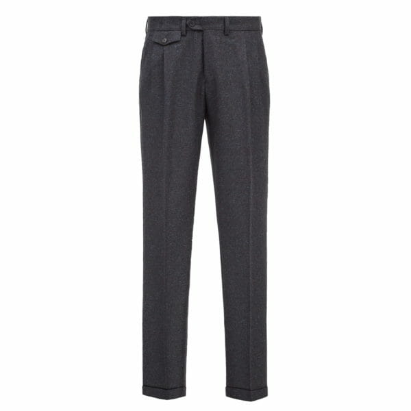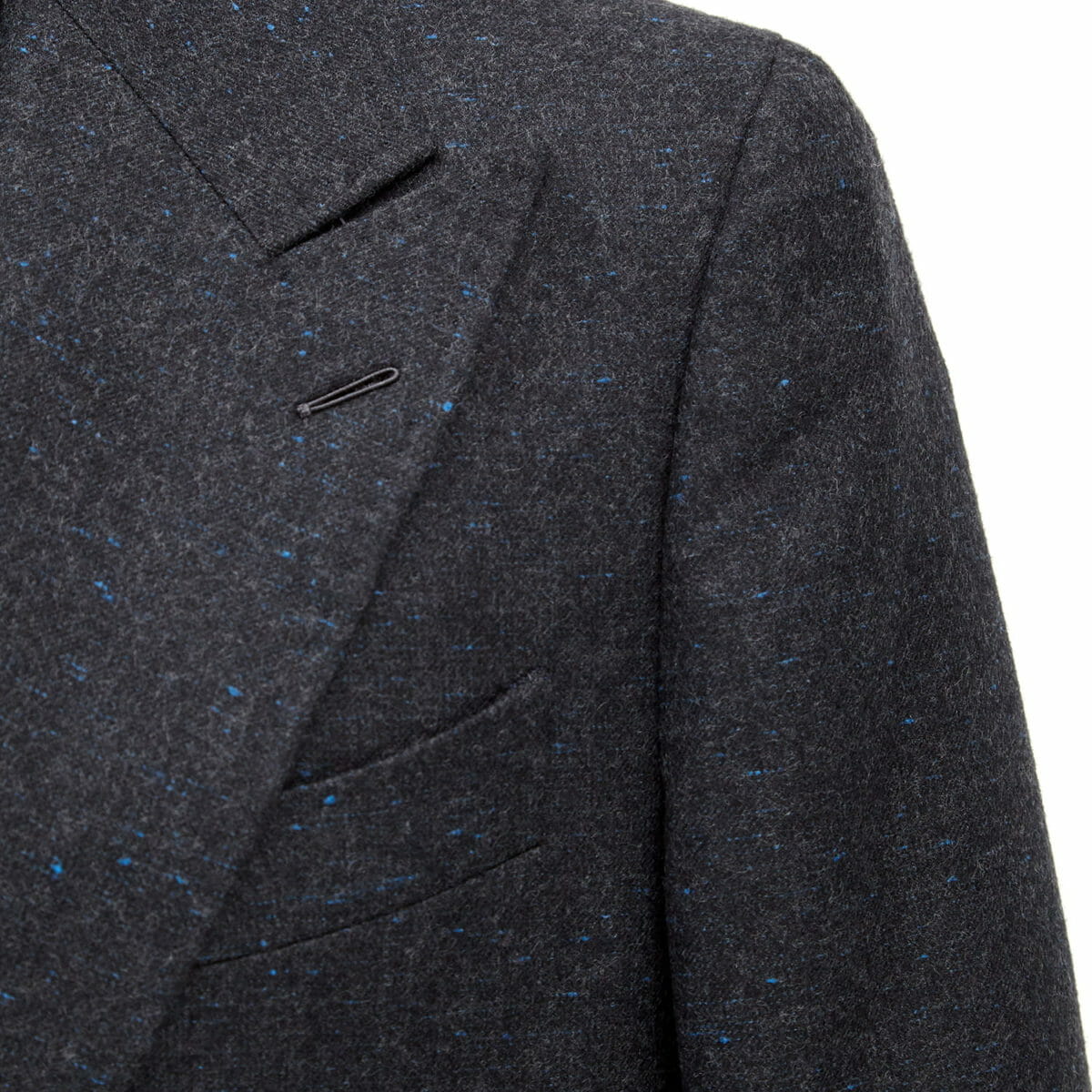 Donegale w ziemistych kolorach wzbudzają mocne skojarzenia z klasycznym stylem irlandzkiej prowincji (Irish country look), o którym w zajmujący sposób opowiadał mi w Dublinie Noel Kevin. No i ja lubię tego rodzaju ubrania, ale przecież nie w każdych okolicznościach się sprawdzą, zwłaszcza u nas, na kontynencie. Dlatego złożyłem w tkalni Abraham Moon & Sons specjalne zamówienie: prosty i charakterny donegal z grafitowej wełny. Ożywia go delikatny melanż i plamki z niebieskiej przędzy. Efekt jest dokładnie taki, jak chciałem.