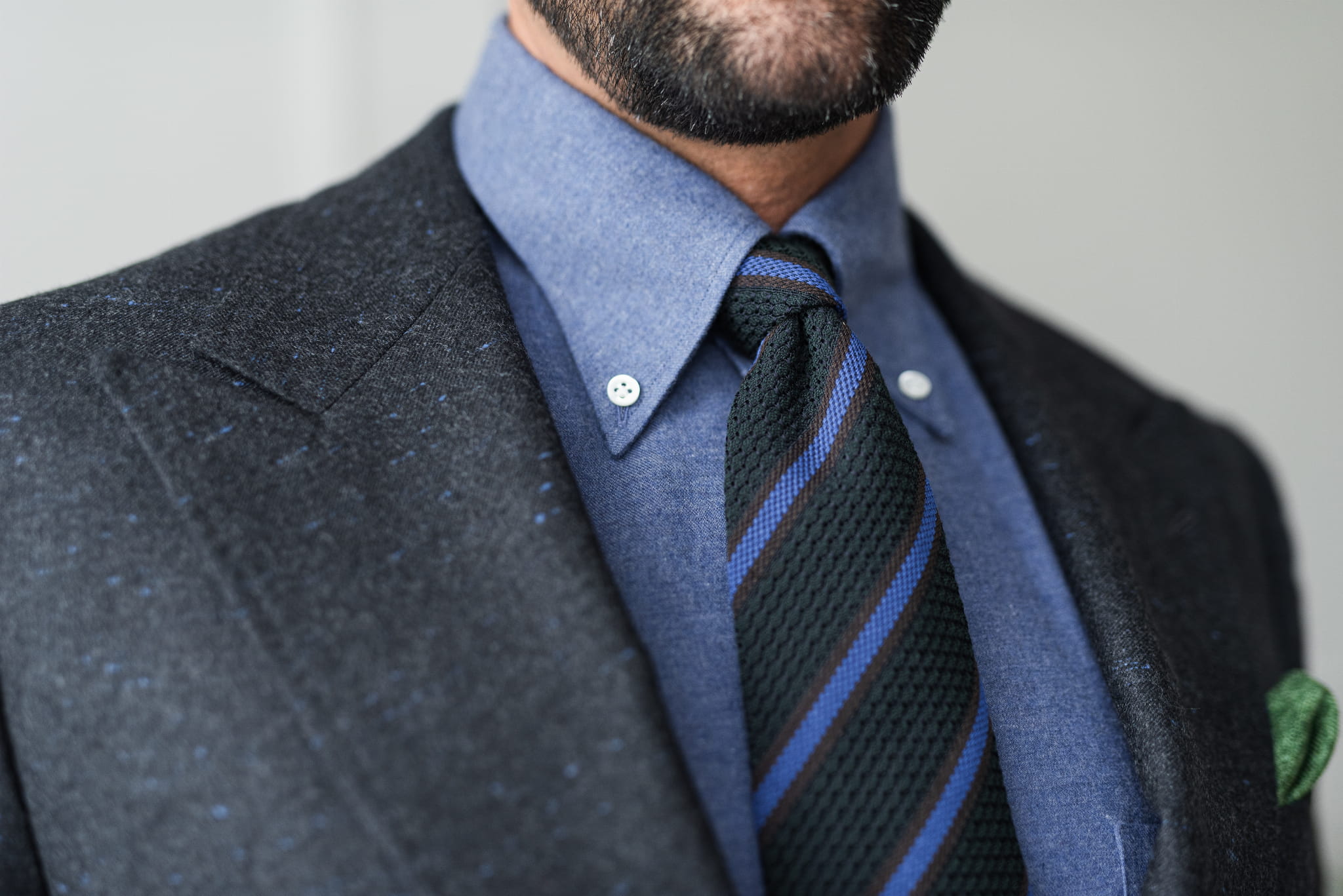 Ciemnoszary donegal jak najbardziej sprawdzi się w biurze czy w szykownej restauracji. Z bliska widać, że garnitur nie został uszyty z wełny czesankowej, ale nadal wygląda dość elegancko. Wystarczy go uzupełnić białą lub błękitną koszulą biznesową. Jeśli chodzi o krawat, polecam grenadynę albo drukowany jedwab.