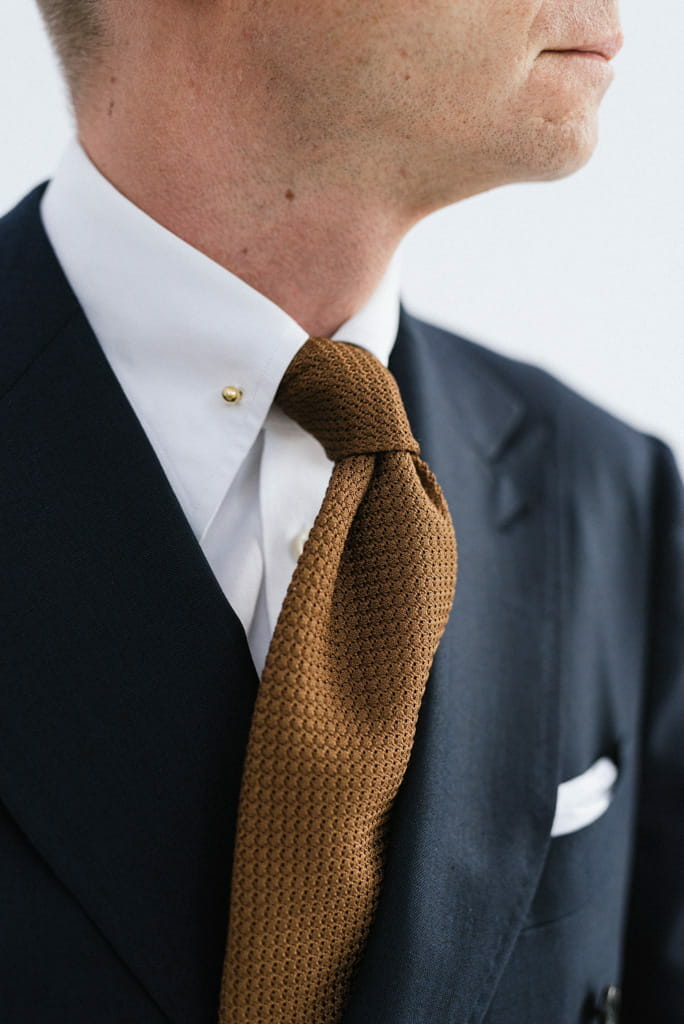 Tym sposobem ciemnogranatowy garnitur dwurzędowy stał się mniej konserwatywny. Oczywiście Gianni sprawdzi się podczas uroczystości i w biznesie (wówczas koszula pin collar doda mu formalnego sznytu). Ale marynarkę można bez problemu nosić z jasnymi spodniami w zestawie klubowym. Sprzyja temu delikatna faktura, tworząca widoczny z bliska deseń, zwany skórą rekina. Również spodnie w sartorialnym stylu, z zakładkami, da się wpasować w zestaw z marynarką w innym kolorze – na przykład szarym.