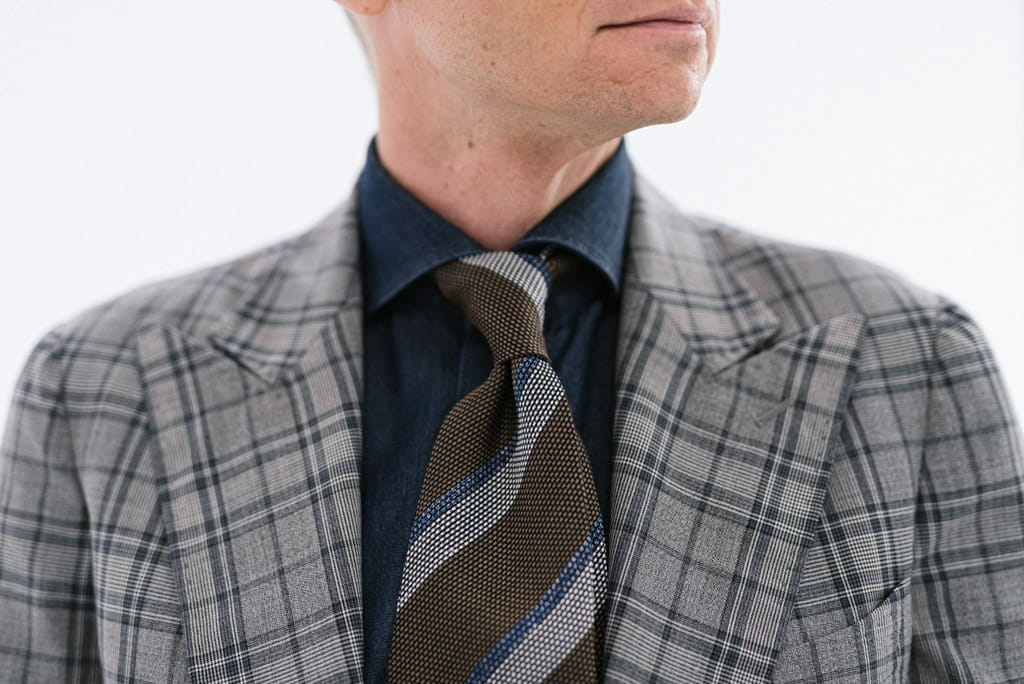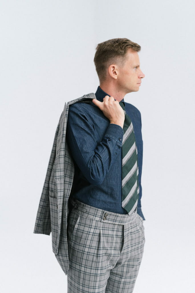 A czy ten garnitur faktycznie nadaje się na lato? Oczywiście! Konstrukcja half canvas (płótno na odcinku piersiowym) pomaga tkaninie odprowadzać ciepło na zewnątrz. Cienka wełna Huddersfield Fine Worsteds należy niewątpliwie do przewiewnych. Zastosowaliśmy też oddychającą półpodszewkę – wszystko dla komfortu noszącego.