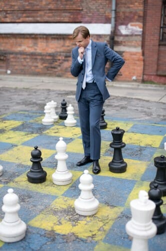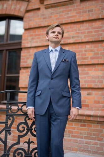 Przymiarka tego garnituru tydzień temu wypadała fatalnie. Nie byłem zadowolony z tego, co wtedy zobaczyłem. Marynarka wyglądała, jakby była o dwa numery za duża.Od kilku dni obaj czekaliśmy na odbiór garnituru w dużym napięciu. Każdemu z nas zależało na dobrym wyniku końcowym. Kibicuję projektowi Lazar MTM i wspieram polskie firmy, które chcą dostarczać klientom bardzo dobre produkty w rozsądnych cenach.