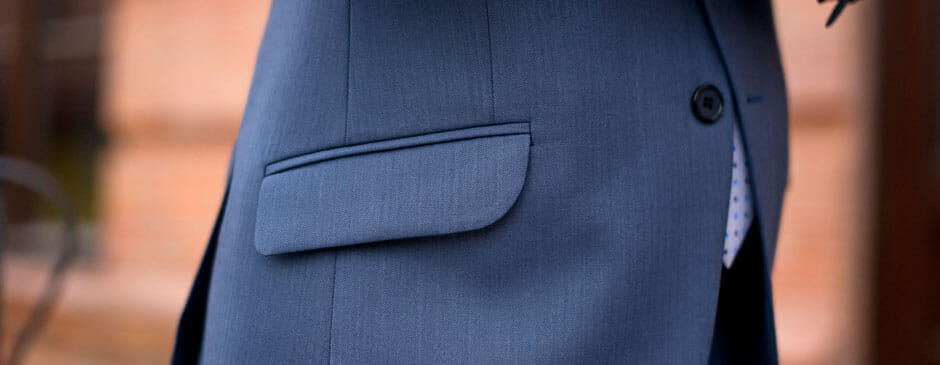 Marynarka została wykonana na klejonce. Dziurki na guziki są otwarte, ale szyte maszynowo. Lazar zadbał o detale i postarał się nawet wszyć pętelkę na łodygę kwiatka na wewnętrznej stronie klapy pod butonierką. Butonierka jest oczywiście przecięta. Z drobnych mankamentów nie podoba mi się przyszycie guzików. Powinno być na tzw. krzyżyk, a tutaj wygląda jakby zaraz miały odpaść. Kieszonka piersiowa jest za długa, ale na szczęście jest wysoko położona. W nogawkach spodni zarys podwiniętego od wewnątrz mankietu nie powinien być widoczny.