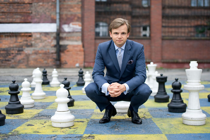 Stalowy garnitur w jodełkę z niebieską koszulą na spinki oraz jedwabnym krawatem. Z brustaszy wystaje poszetka (wypustka). Całość dopełniają czarne buty wiedenki lub oksfordy.