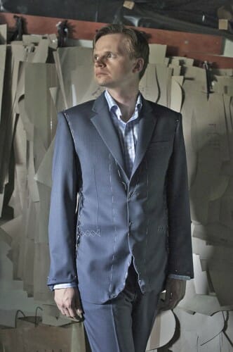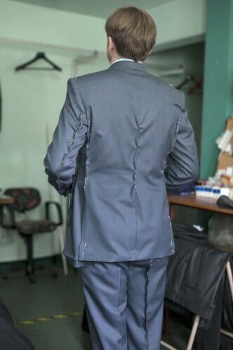 Pani Renata z kontroli jakości, która nanosiła poprawki, podchodziła dosyć powściągliwie do moich pomysłów i musiałem ją przekonać, że teraz tak właśnie chcą ubierać się eleganccy mężczyźni. Ja zdecydowanie wolę, żeby niesławny rękaw marynarki był centymetr za krótki niż centymetr za długi i nie boję się ciachać i zwężać. Dotychczasowi klienci Lazara są bardzo konserwatywni, w złym tego słowa znaczeniu: koszula nie powinna wystawać zza rękawów marynarki, nogawka powinna sięgać obcasa, a garnitur nie może być zbyt opięty. Mam nadzieję, że uszycie garnituru petrol blue pomoże to zmienić. Na Śląsku brak przecież firm robiących dobre garnitury pasowane we współczesnym, wyszczuplonym fasonie. Wynik końcowy opublikuję jeszcze przed moim wyjazdem do Londynu 29 sierpnia.