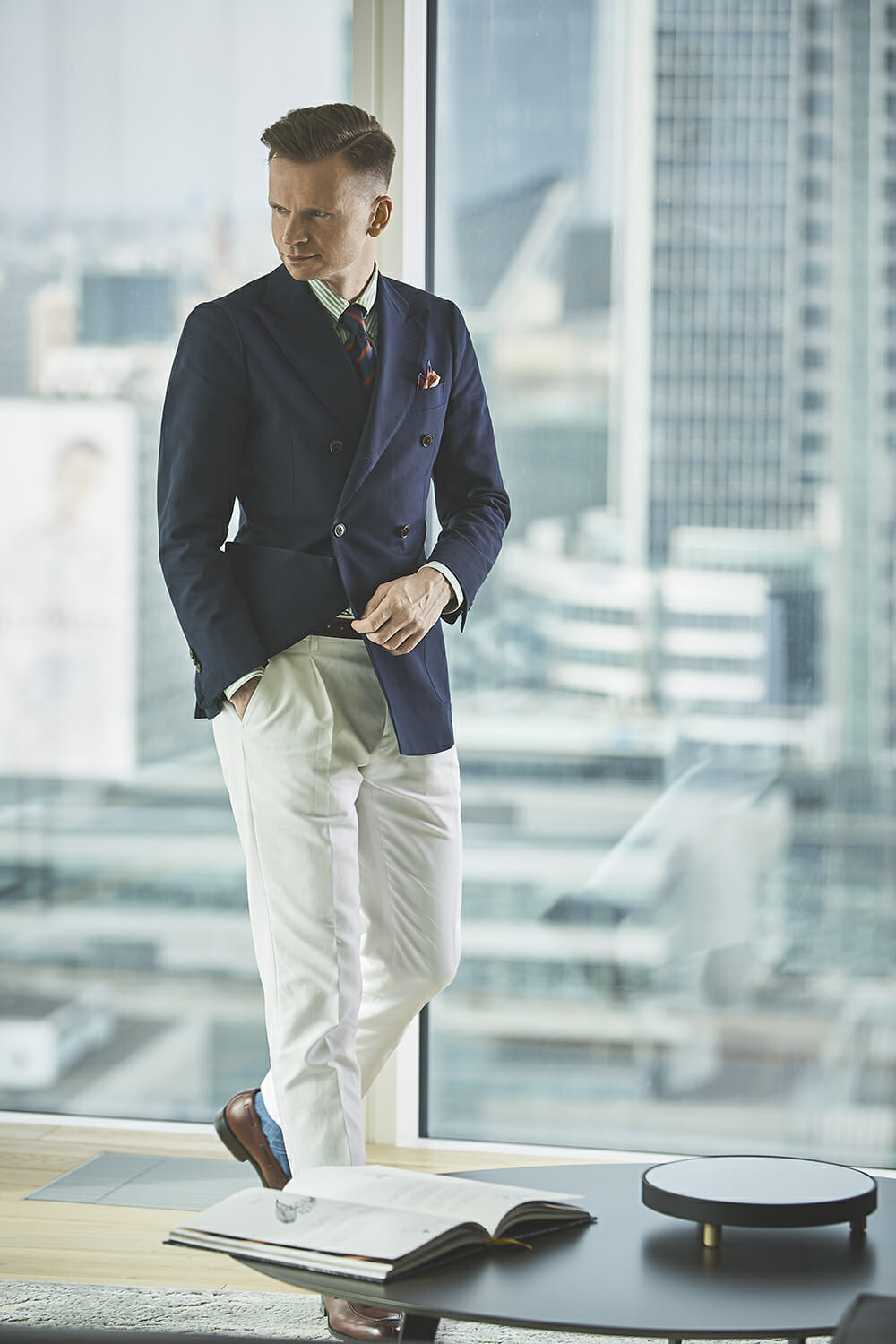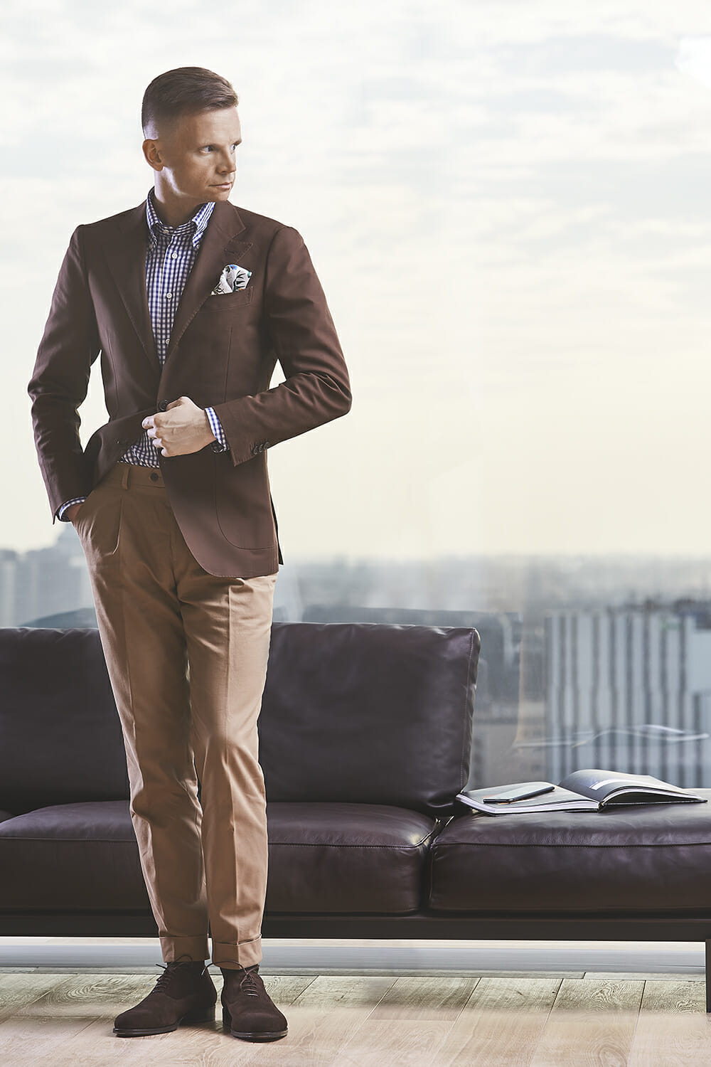 Pod względem fasonu marynarki zdecydowanie się wyróżniają. Dwurzędówka jest zapinana na dwa i pół guzika. Na klapie widać ładnie obszytą dziurkę, a najwyższy guzik pozostaje niezapięty. Dzięki temu marynarka zyskuje polot i nabiera bardziej swobodnego charakteru. Taki fason stał się niedawno obiektem pożądania wśród zwolenników sportowych marynarek jednorzędowych – dwa i pół guzika oferowały nawet niektóre sieciówki. Ale w przypadku dwurzędówek jest to nowość na polskim rynku. Niespotykane są również tak mocno zaostrzone, rogate klapy.