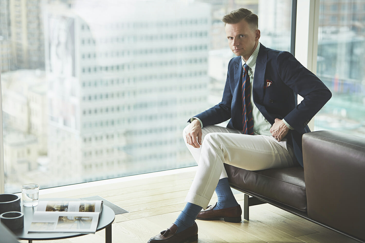 Matowa tkanina bawełniana ma wyraźnie mniej formalny charakter od wełny czesankowej, dlatego łatwo ją łączyć z rzeczami w stylu casual. Koszule w śmiałe wzory, lekkie spodnie z lnianego płótna, krawat typu knit – wszystko pasuje.