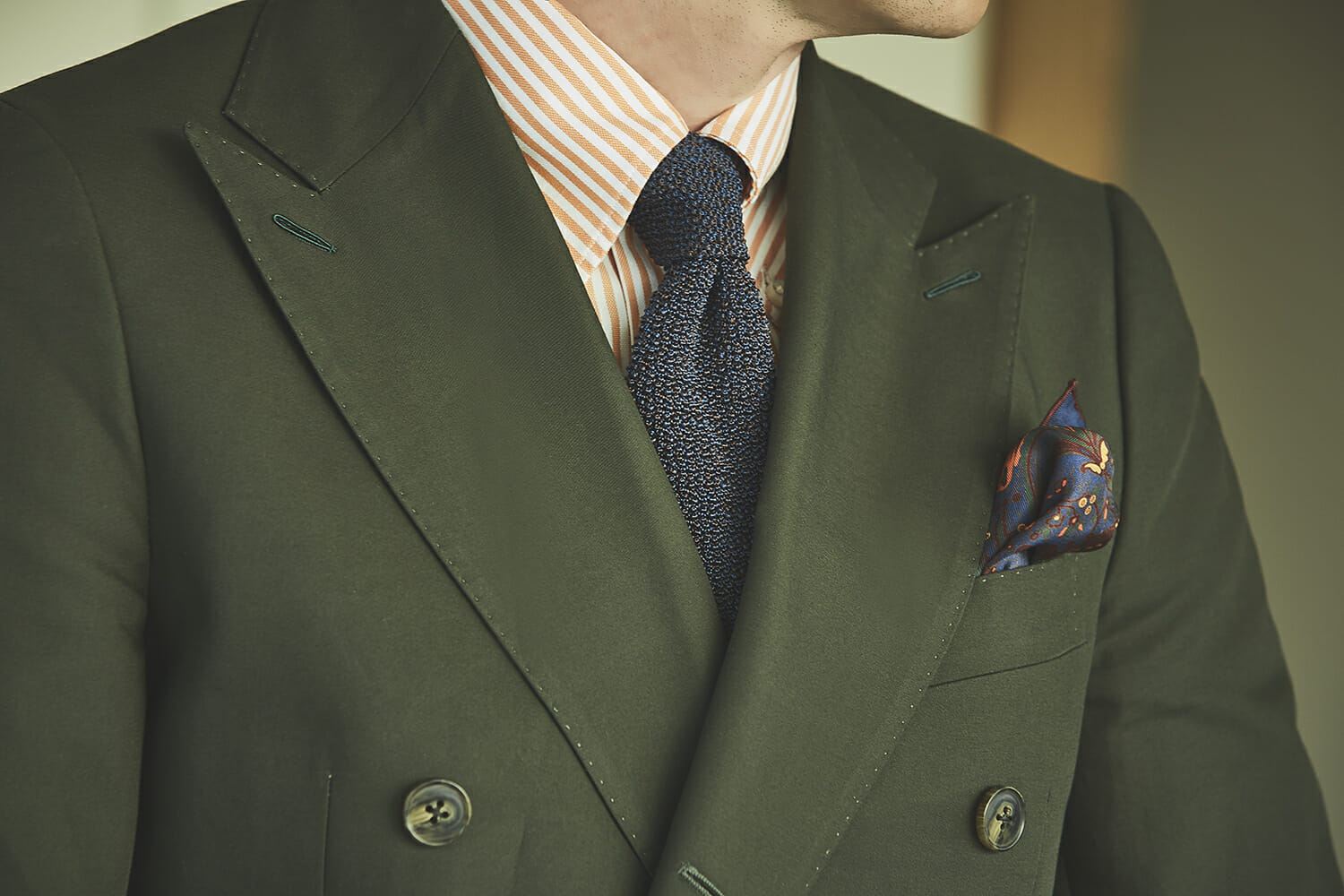 Zielona marynarka dwurzędowa i pomarańczowa koszula
