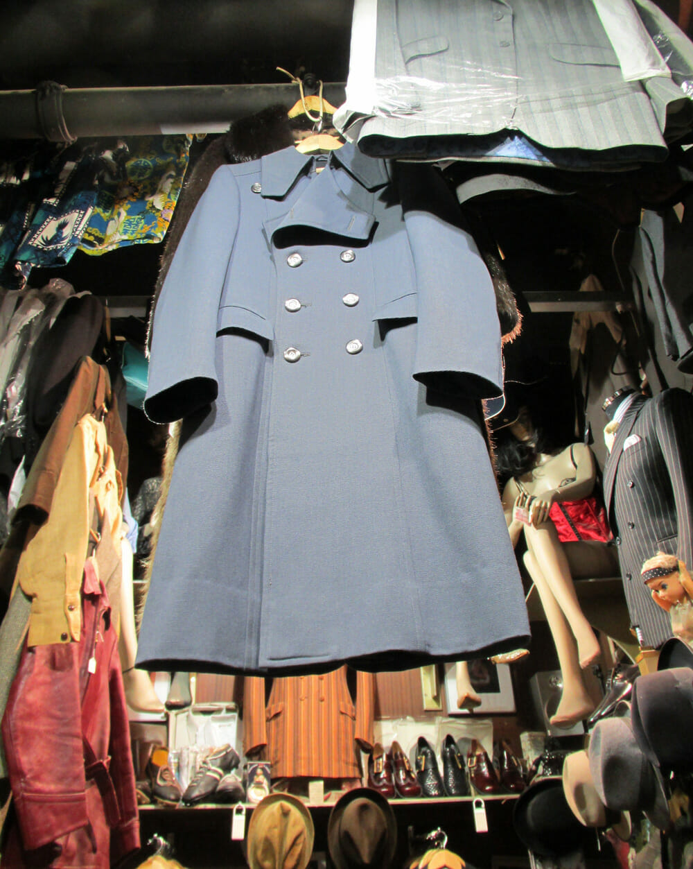 Granatowy płaszcz dwurzędowy w sklepie vintage A Dandy in Aspic w Camden Town, London. Vintage double breasted overcoat