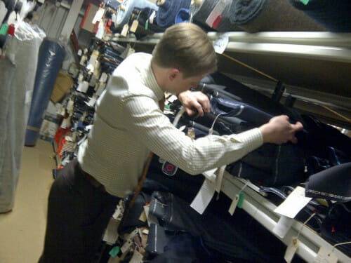Teraz jest rzadka okazja do nabycia materiałów Lumbs Golden Bale z lat. 80 i 90. Osobiście wybrałem najlepsze kąski z magazynu H. Lesser w Exeter. Pół dnia myszkowałem w składzie tkanin. Selekcja była bolesna i trudna, ale musiałem podejść rozważnie. 100% mohery z ery The Beatles musiałem zostawić na inny raz. Przywiozłem głównie gładkie kupony garniturowe (między 3m, a 4m). Jest też kilka kuponów spodniowych i marynarkowych, Do większości kuponów jest dołączona etykietka z oznaczeniem, kiedy tkanina została wyprodukowana, ile metrów miała oryginalnie bela i jak przebiegał jej proces sprzedaży. Są zarówno tropiki w gramaturze 260, jak i wełny czesankowe 330g i 400g oraz flanele 400g. Część tkanin nie ma oznaczenia Lumbs i pochodzi z innych próbników Lessera. Najstarsza tkanina New Status z domieszką kaszmiru pochodzi z końca lat 60. XX w.!