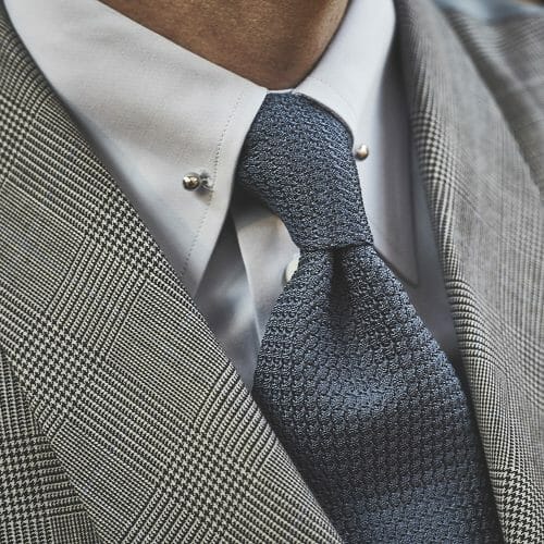 A jaki w jakim kolorze powinien być krawat ślubny? Pod rozwagę warto wziąć przede wszystkim odcienie szarości i granatu. Do granatowego garnituru polecam szczególnie krawat w kolorze srebrnoszarym. Może być gładki albo w mikrowzór. Jeśli zależy nam na wyglądzie angielskiego dżentelmena, warto rozważyć krawat w czarno-białą pepitkę lub kratkę księcia Walii.