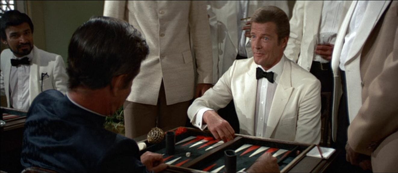 „Człowiek ze złotym pistoletem” z 1974 roku to już występ Rogera Moore’a – w kilku godnych uwagi zestawach. Jeden z nich to jasny smoking dwurzędowy. Sześć guzików, wypełnione ramiona i bardzo szerokie, choć proporcjonalne klapy ostre – wszystko to powiększa sylwetkę. Czy nie za bardzo? Kwestia gustu. Warto zwrócić uwagę na dość dużą muchę. Mniejsza nie wyglądałaby dobrze, ale jeszcze większa byłaby przesadą. Kostiumografom należy się pochwała za dbałość o szczegół.