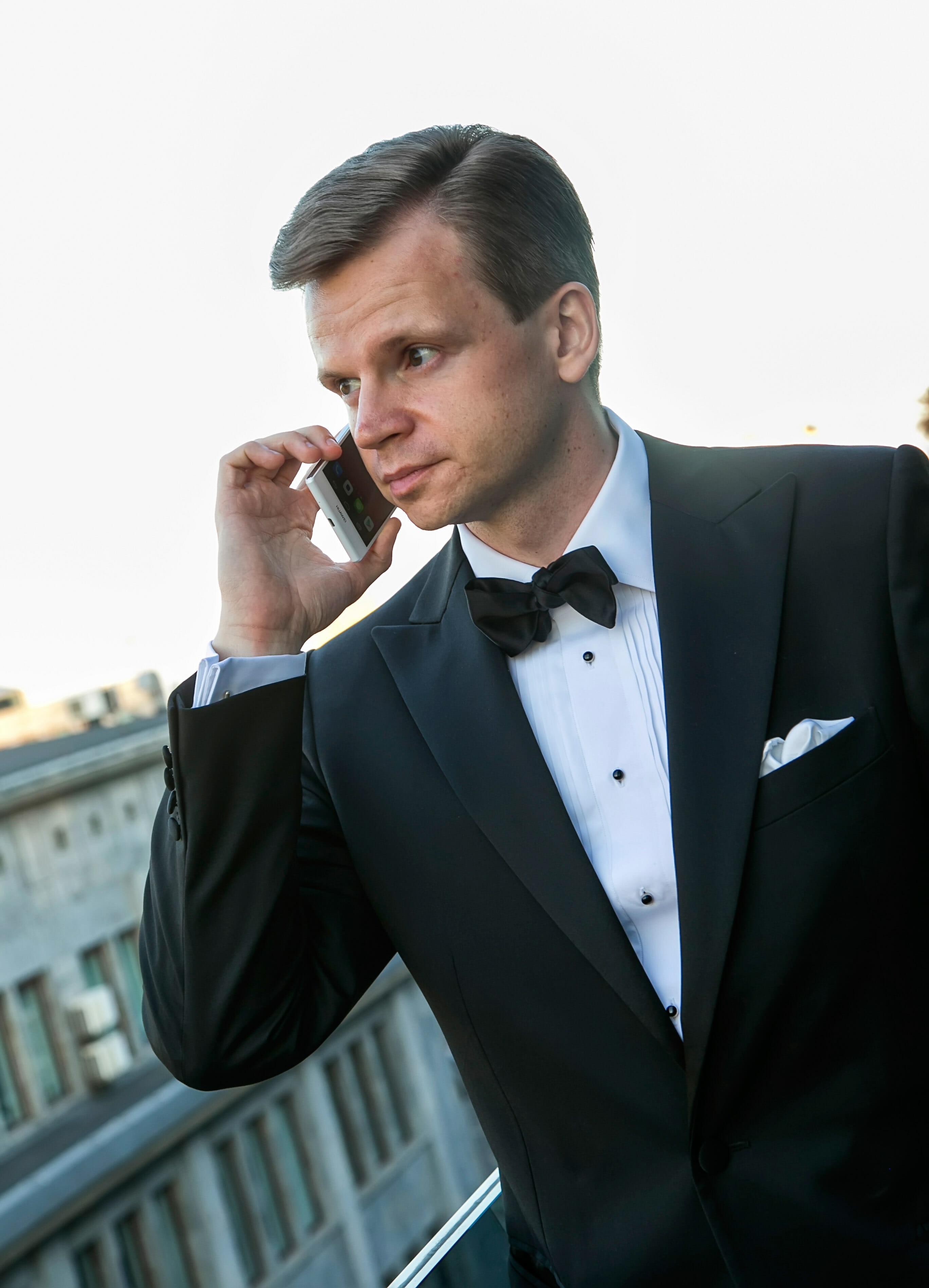 Mężczyzna w czarnym smokingu z wiązaną muchą w białej koszuli na spinki i z białą poszetką