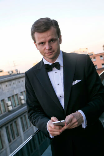 Roman Zaczkiewicz, autor bloga Szarmant.pl, podczas gali black tie zorganizowanej przez Huawei w VitkAcu na ulicy Brackiej w Warszawie w Restauracji Concept. Ma na sobie czarny smoking jednorzędowy, białą koszulę z plisą na guziki jubilerskie, wiązaną czarną muchę oraz białą poszetkę z jedwabiu. Testuje najnowszy model Huawei Ascend P7 na tarasie na 5 piętrze w DT vitkAc Bracka 9