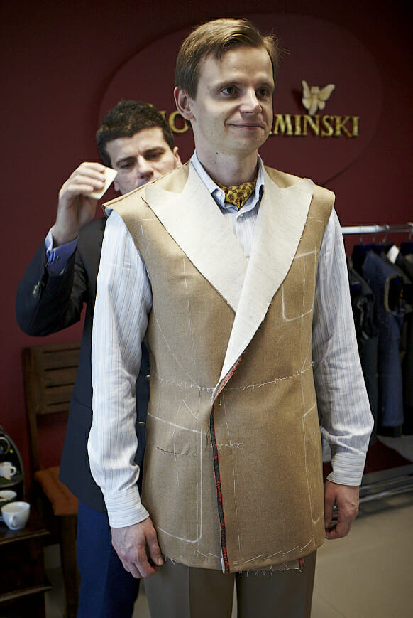 Pierwsza przymiarka u Piotra Kamińskiego. First fitting aka skeleton base lub try-on. Polish bespoke in Warsaw