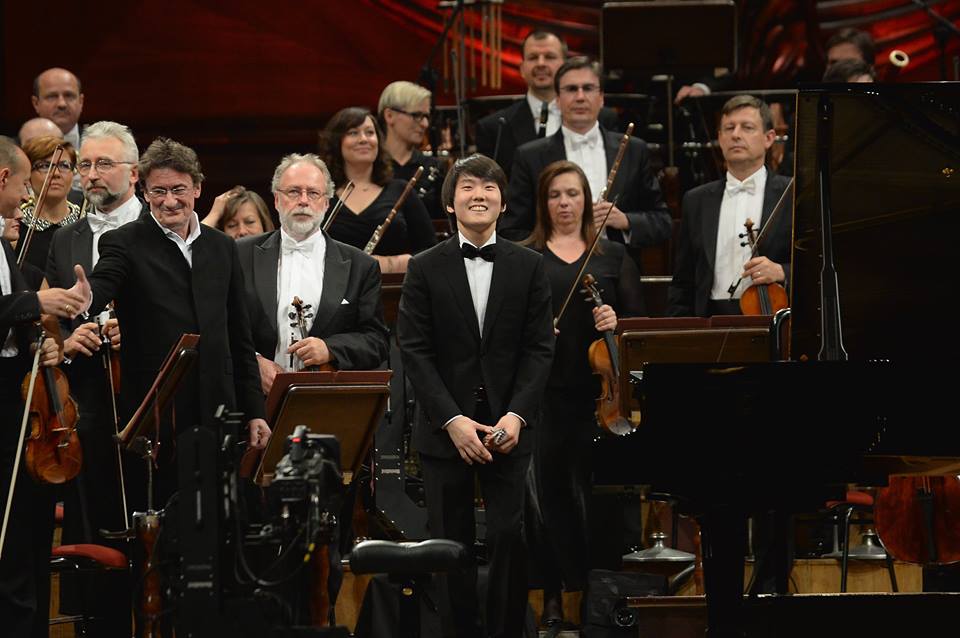 A zwycięzca, Seong-Jin Cho? Początkowo występował w garniturze z zapiętą na ostatni guzik białą koszulą (tzw. air tie). Jest to trend modny w Europie Zachodniej, ale nie jestem do niego przekonany. Muszka czy krawat zdobi i nie widzę powodu żeby z nich rezygnować. Na szczęście na koncercie finałowym Seong Jin Cho dodał do tego czarną muszkę i już było znacznie lepiej. Ale i tak laureatowi daleko do ubranych we fraki członków orkiestry. Zwróćcie zresztą uwagę, że muzycy mają białe muszki pod szyją co jest zgodne z zasadami dress code. Biała muszka – frak, a czarna – smoking.