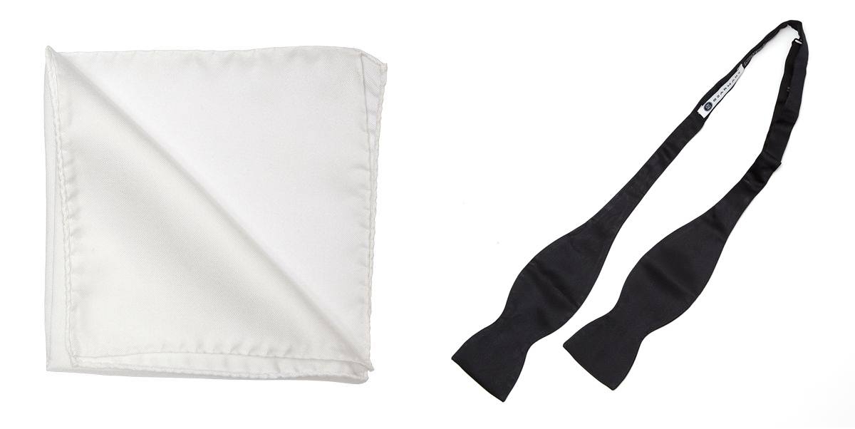 Biała poszetka i czarna, wiązana muszka dostępna w http://sklep.szarmant.pl/
