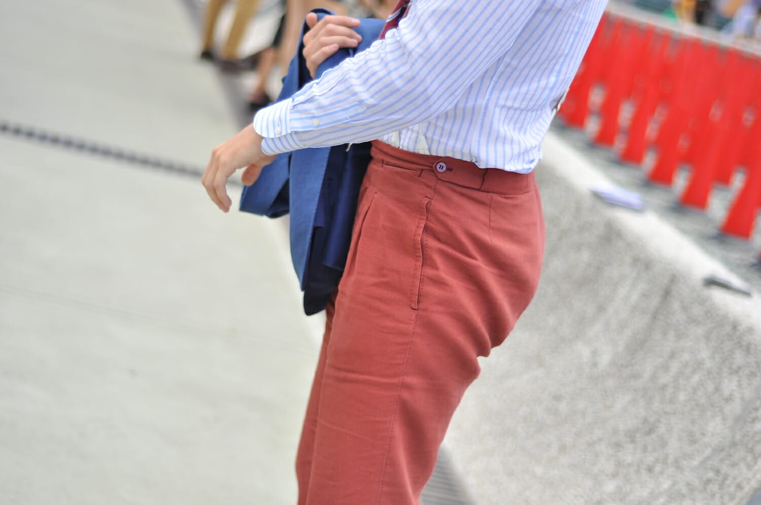 Spodnie wykonano z lnu od Dugdale Bros. Niestety ten materiał nie jest już dostępny. Mają bardzo charakterystyczne zakładki, zwane po angielsku kissing pleats. Takie całujące się zakładki wychodzą z góry z jednego punktu, są skierowane do siebie i stopniowo się rozszerzają ku dołowi. Trudno mi wskazać inne zalety, niż estetyczne takich zakładek. Od pewnego czasu stałem się zwolennikiem spodni z zakładkami. Po prostu czuję się w nich wygodniej, niż w tzw. flat frontach. Przedkładam komfort nad duży stopień dopasowania.