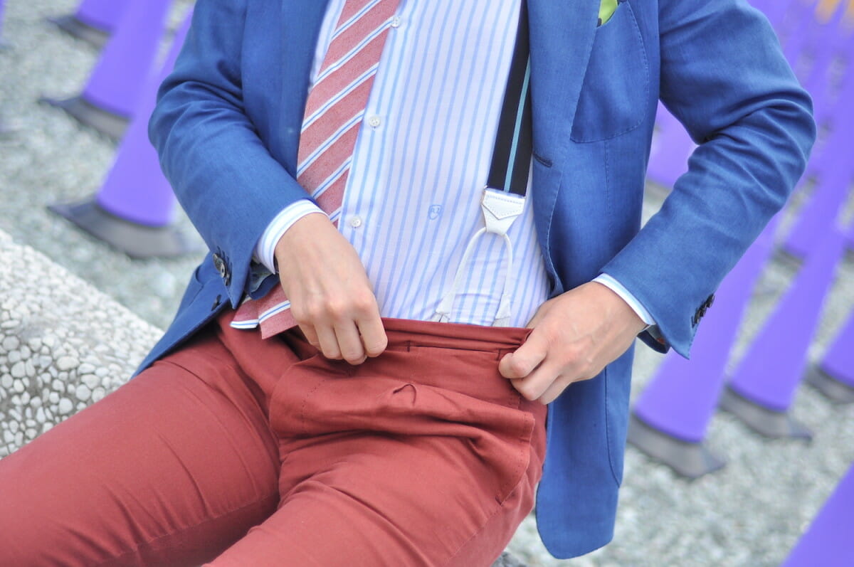 Spodnie są oczywiście na szelki. Planowałem chwycić je tylko na bocznych klamerkach, ale niestety się zsuwały. Zresztą nie pierwszy raz mnie to spotyka. Wszystkie spodnie na boczne klamerki, jakie mam, w trakcie dnia zsuwają się w pasie. Po prostu pasek czy klamerki z boku nigdy nie zastąpią szelek. Jeśli chcesz, żeby spodnie się nie zsuwały, a w trakcie dnia nie chcesz myśleć o ich podciąganiu, to jedyną opcją są szelki.