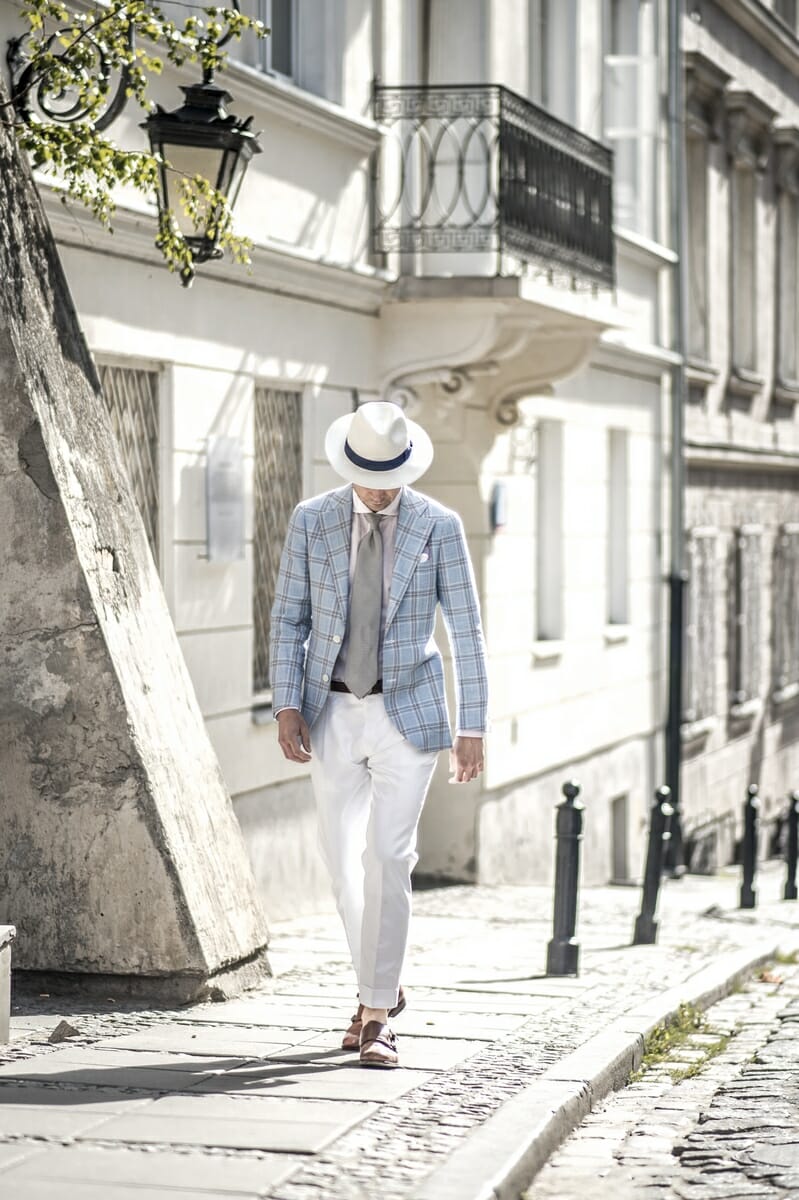 Najlepszą odpowiedzią na lato, jaką wypracowało tradycyjne krawiectwo europejskie, jest giacca napoletana. Neapolitańska marynarka, bo to o niej mowa, przyjmuje różne formy (więcej na ten temat w artykule o włoskich szkołach krawieckich). Najbardziej klasyczna z nich wygląda właśnie tak jak na powyższym zdjęciu.