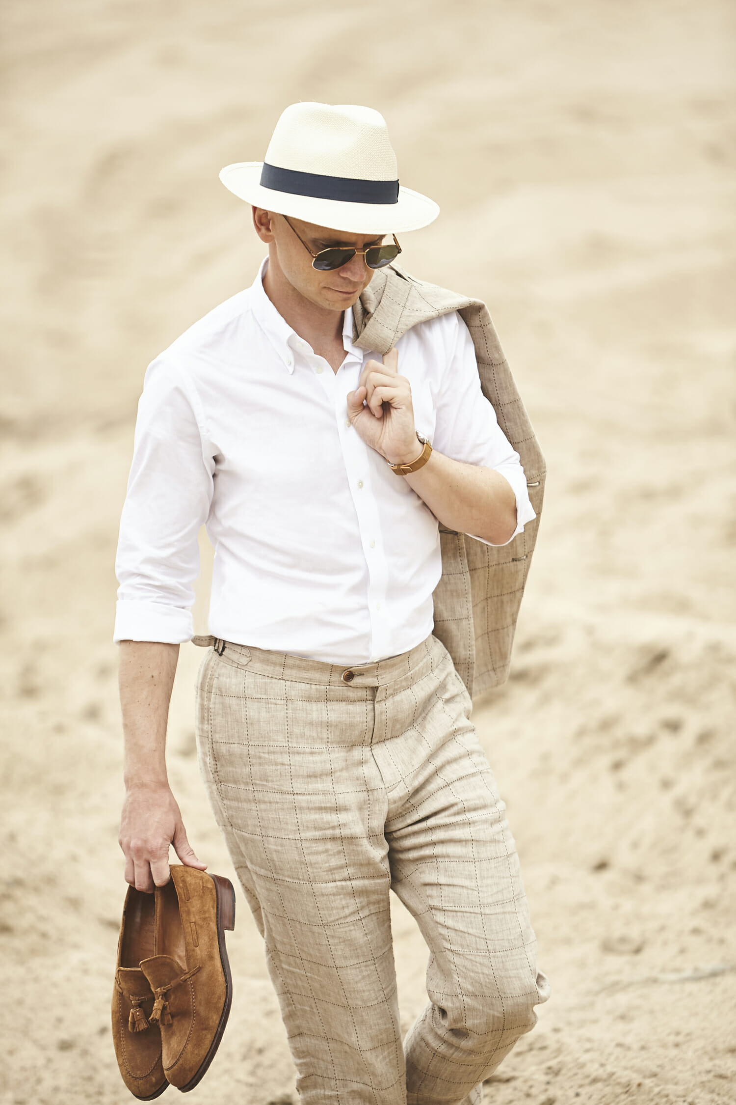 Piasek, lninany garnitur i kapelusz