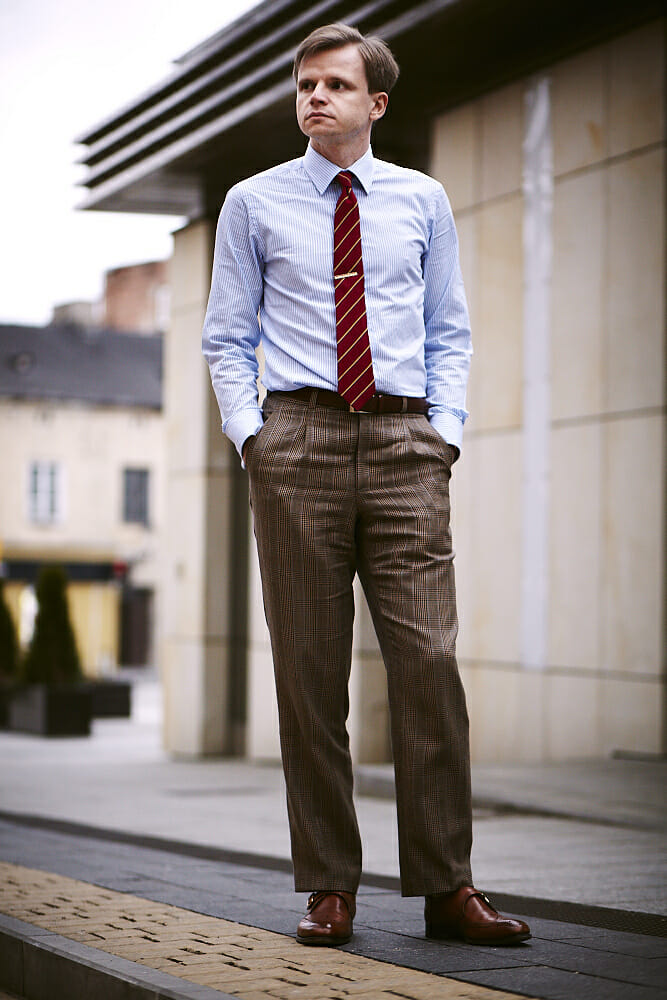 Spodnie na miarę Janusz Kruszewski. Spinka do krawata.