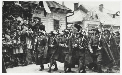 March_down_a_street_in_Sanok_past_a_swastika_1936