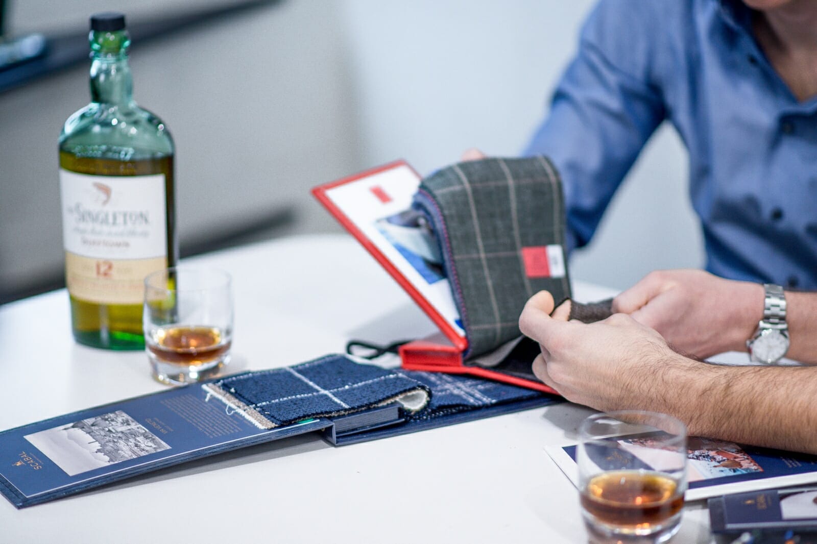 Na szczególną uwagę zasługują rezultaty kooperacji z piemoncką tkalnią Carlo Barbera. Powstały dwa próbniki. Pierwszy, z wełen super 140s, jest przeznaczony na garnitury – składa się głównie ze stonowanych krat, prążków i pepit. Drugi próbnik, złożony z lżejszych wełen, często z dodatkiem lnu i jedwabiu, to szaleństwo dla miłośnika marynarki neapolitańskiej. Jest tu właściwie każdy wzór, o jakim można zamarzyć… i dużo więcej. Wbrew pozorom w krainie whisky dobrze czują włoski styl.