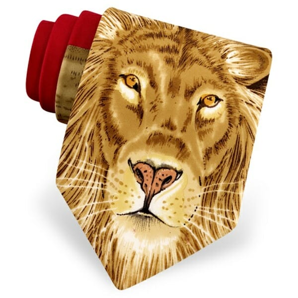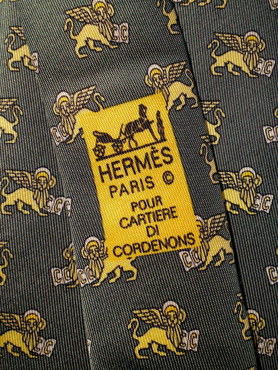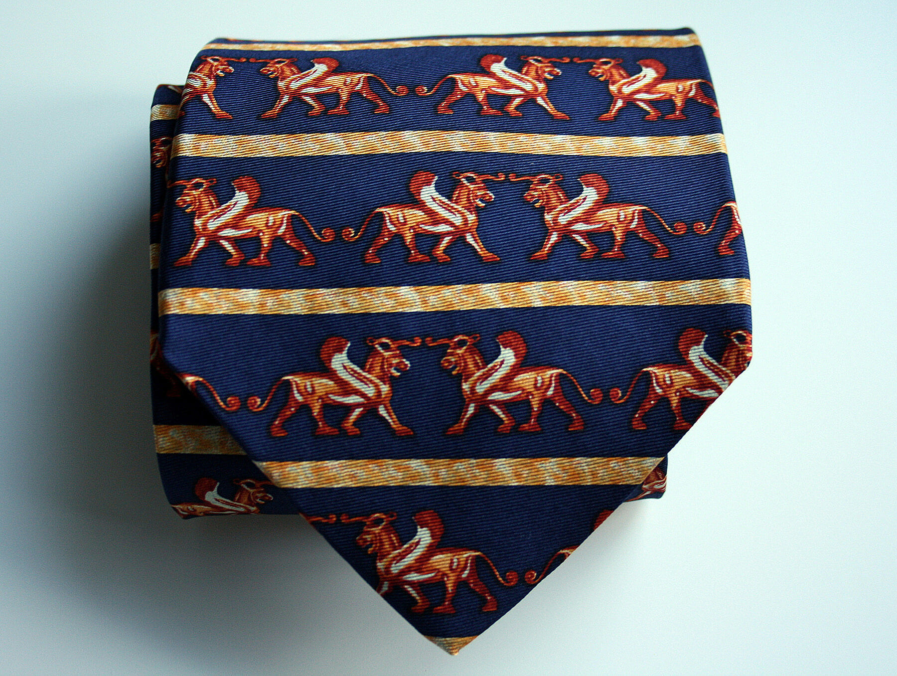 Jeden z dziwniejszych krawatów w mojej szafie może nie jest może bardzo bliski stylistyce Hermèsa, ale przywodzi ją na myśl. Łączy wyraźny rytm geometryczny z przedstawieniami mitycznych zwierząt. Mamy tu kopię skrzydlatych lwów z babilońskich reliefów, które można zobaczyć w Luwrze. Przesadna powaga tego krawata daje efekt groteski. Ze względu na kolorystykę noszę go tylko wieczorami.