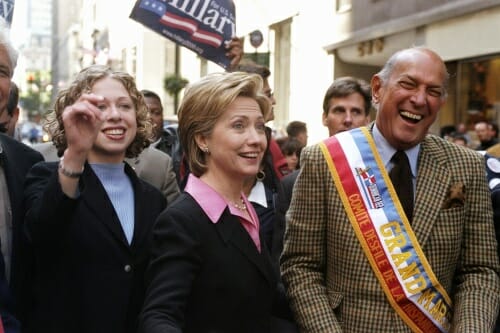 UNITED STATES – CIRCA 2000: Senate hopeful Hillary Rodham Clinton is flanked by her daughter, Chelsea, and Grand Marshal Oscar de la Renta as they walk up Fifth Ave. in the 35th annual Hispanic Day Parade. (Photo by Andrew Savulich/NY Daily News Archive via Getty Images)
