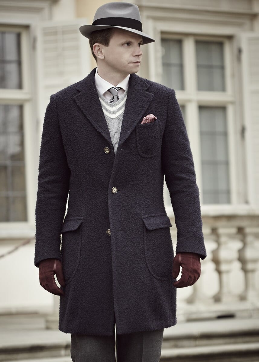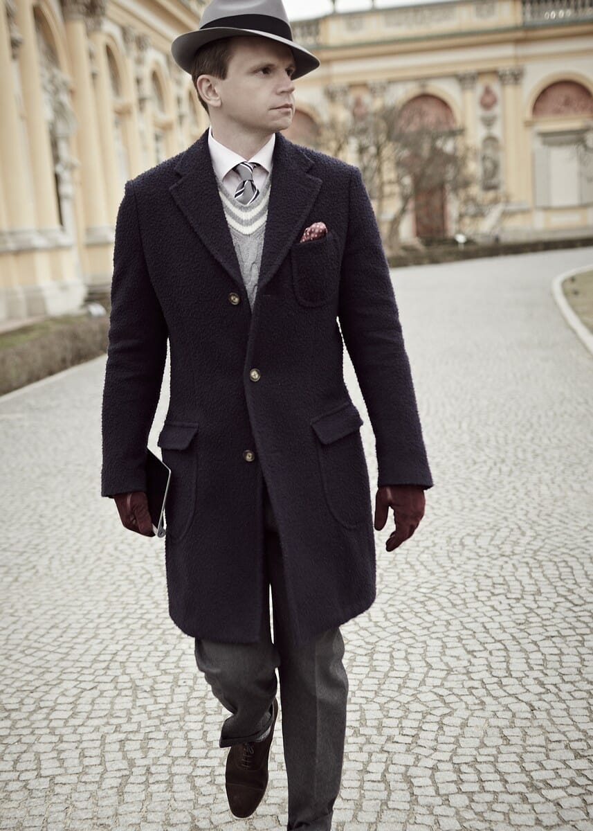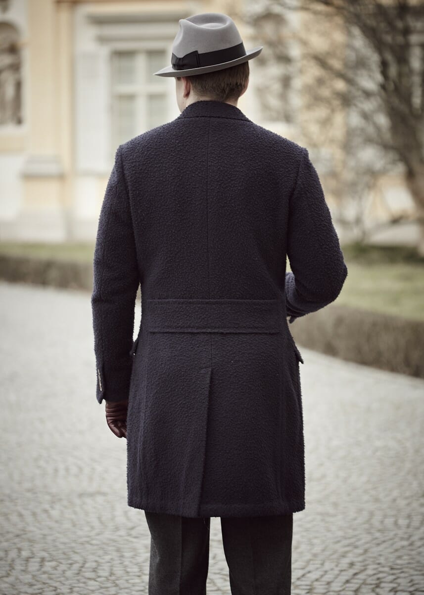 Widoczny płaszcz na zdjęciach to jednorzędówka z nakładanymi kieszeniami. Kieszenie są w nim wyraźnie zaokrąglone i nawiązują do włoskiego stylu szycia. Z tyłu występuje charakterystyczny dla ulstera pas biegnący w poprzek pleców (ang. martingale). W rezultacie wybrany fason jest hybrydą dyplomatki z ulsterem. Zainteresowani mogą przeczytać ten poradnik o eleganckich płaszczach męskich. Płaszcz jednorzędowy jest wykonany na płótnie i posiada ręcznie wydziergane dziurki. Zastosowano lekkie wkłady, a sama konstrukcja płaszcza jest bardzo lekka. Zdecydowaliśmy się użyć podszewki jedynie na odcinku barkowym.