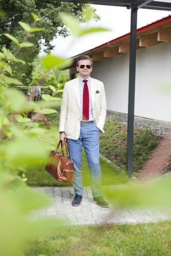 Jedna z zasad klasycznej elegancji mówi, żeby łączyć różne materiały i faktury. Spodnie i marynarka są z lnu, ale już koszula z bawełny, krawat dziergany z jedwabiu a poszetka z drukowanego jedwabiu.
